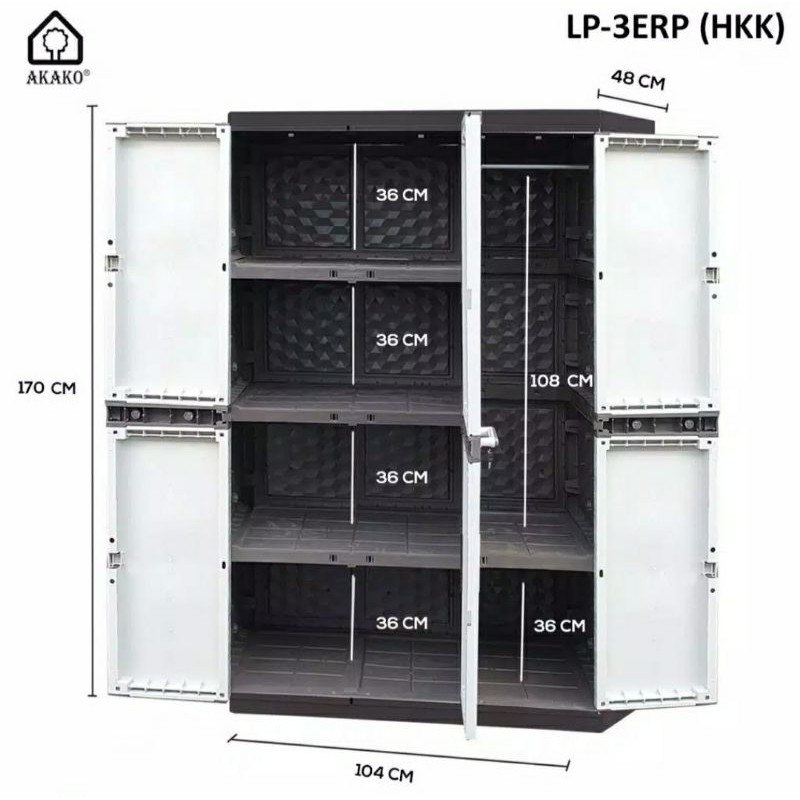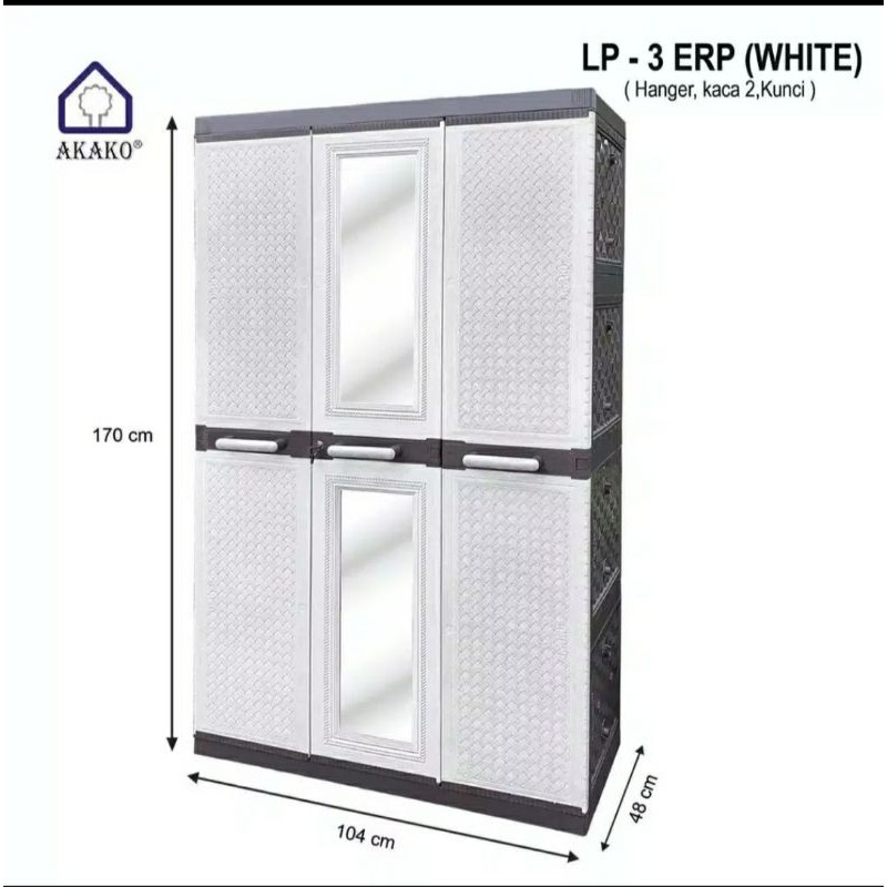 Lemari pakaian baju plastik jumbo 3 pintu rotan akako LP3EP gantung sekat kaca JTR putih cream