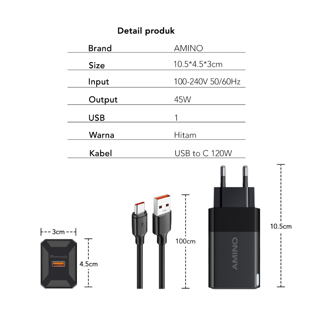 AMINO 45W Kepala Charger USB QC 3.0 Turbo Fast Charger / Travel Adaptor / Super Fast Charging Adaptor TYPE C TO USB / US