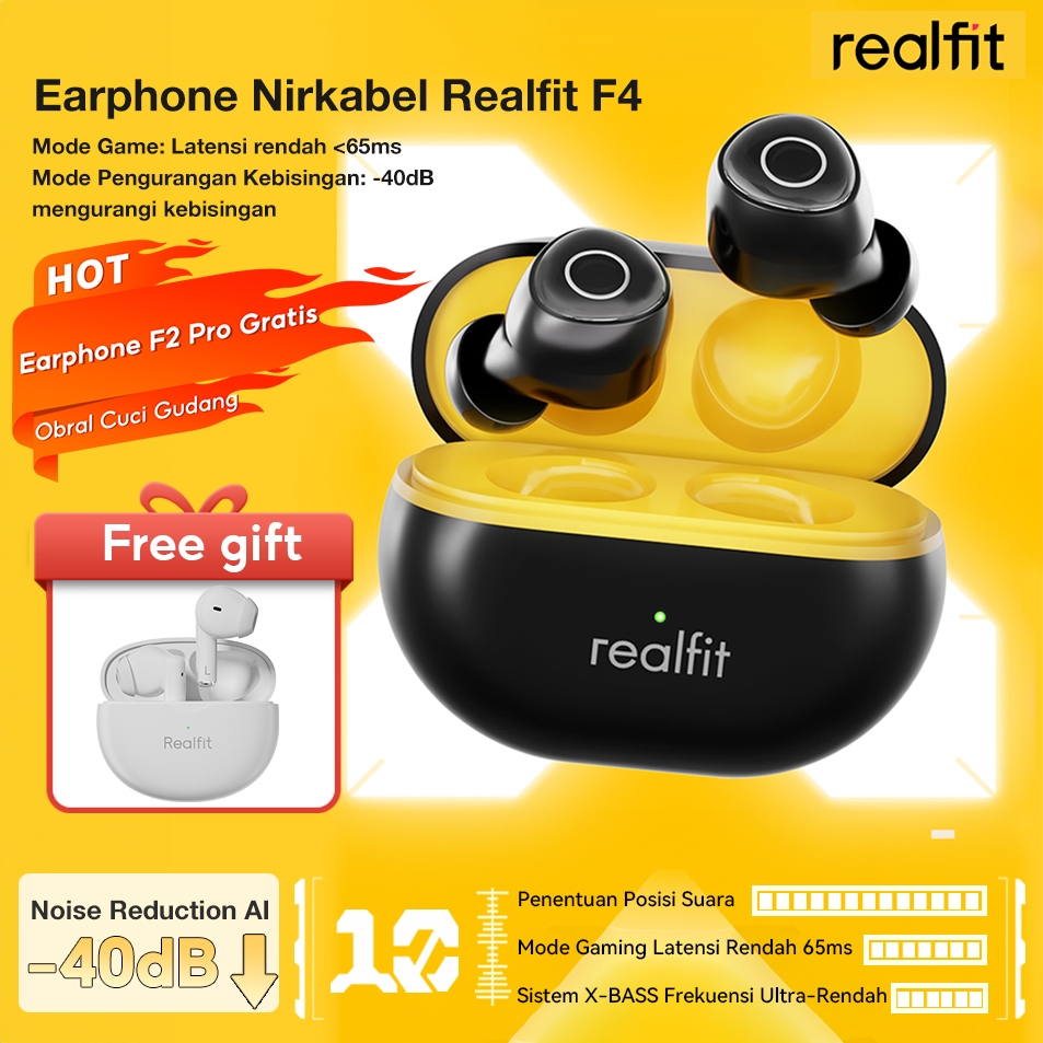 [ Earphone F2pro Gratis ] Realfit F4 AI Noise Cancelling Bluetooth Earphone dengan Kontrol Mikrofon Aplikasi Kustomisasi EQ Latensi Rendah