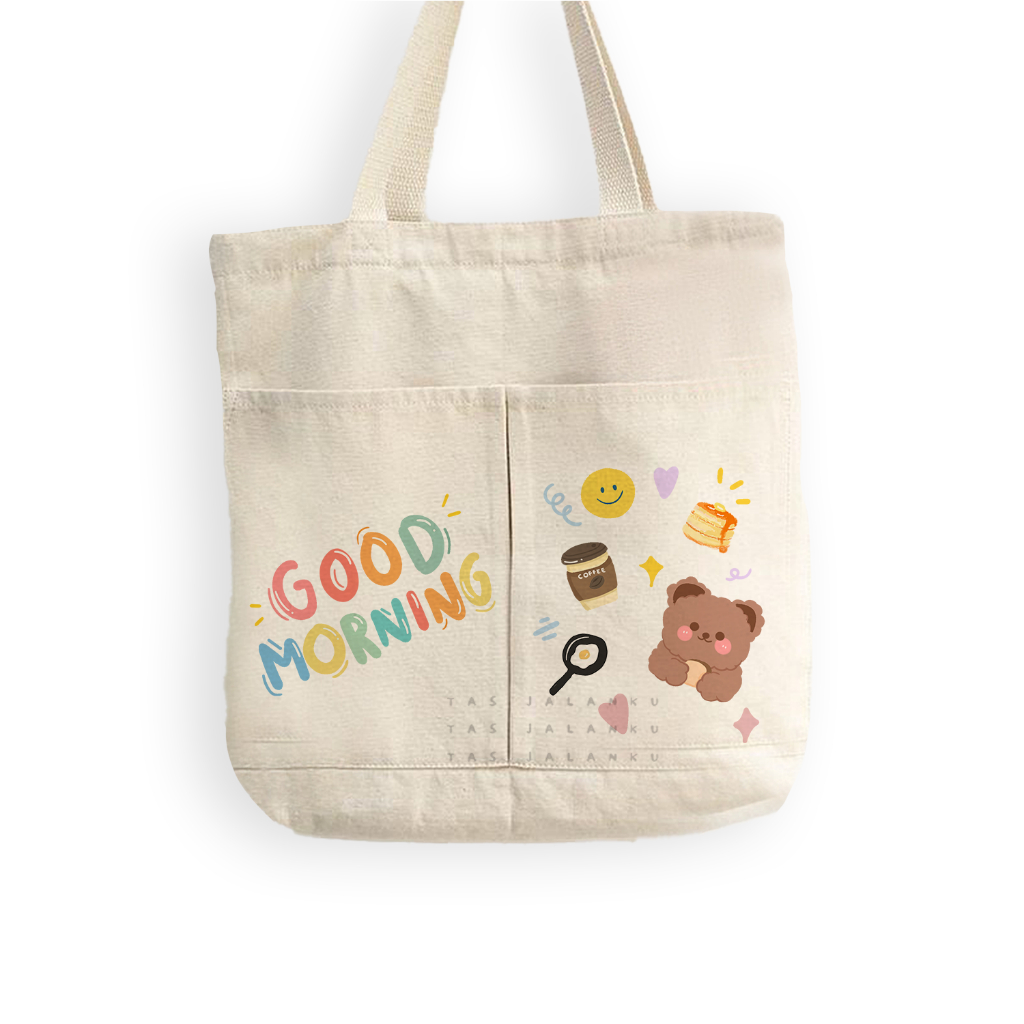 Tasjalanku - Totebag Kanvas Kantong Karakter Lucu Kata Kata Motivasi dua kantong depan bisa muat laptop cocok untuk sekolah kuliah dan jalan