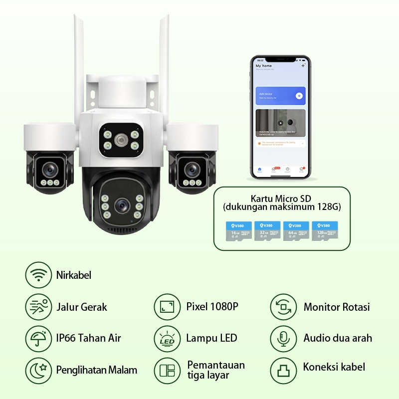 Cctv Wifi Outdoor 3 Lensa Putar 360° Pantau Rumah Hp Malam Jelas Audio Dua Arah Tahan Hujan Garansi