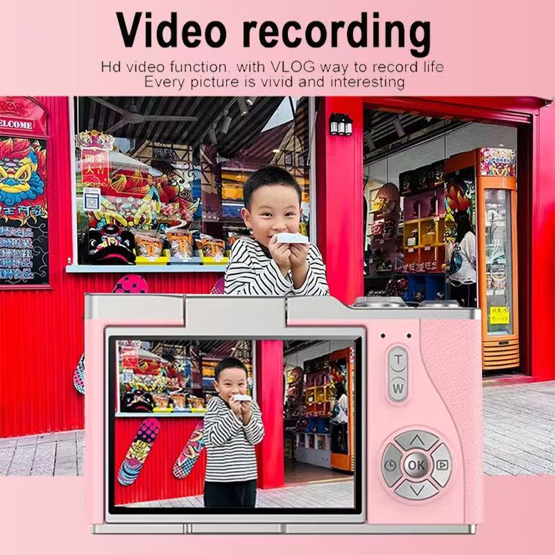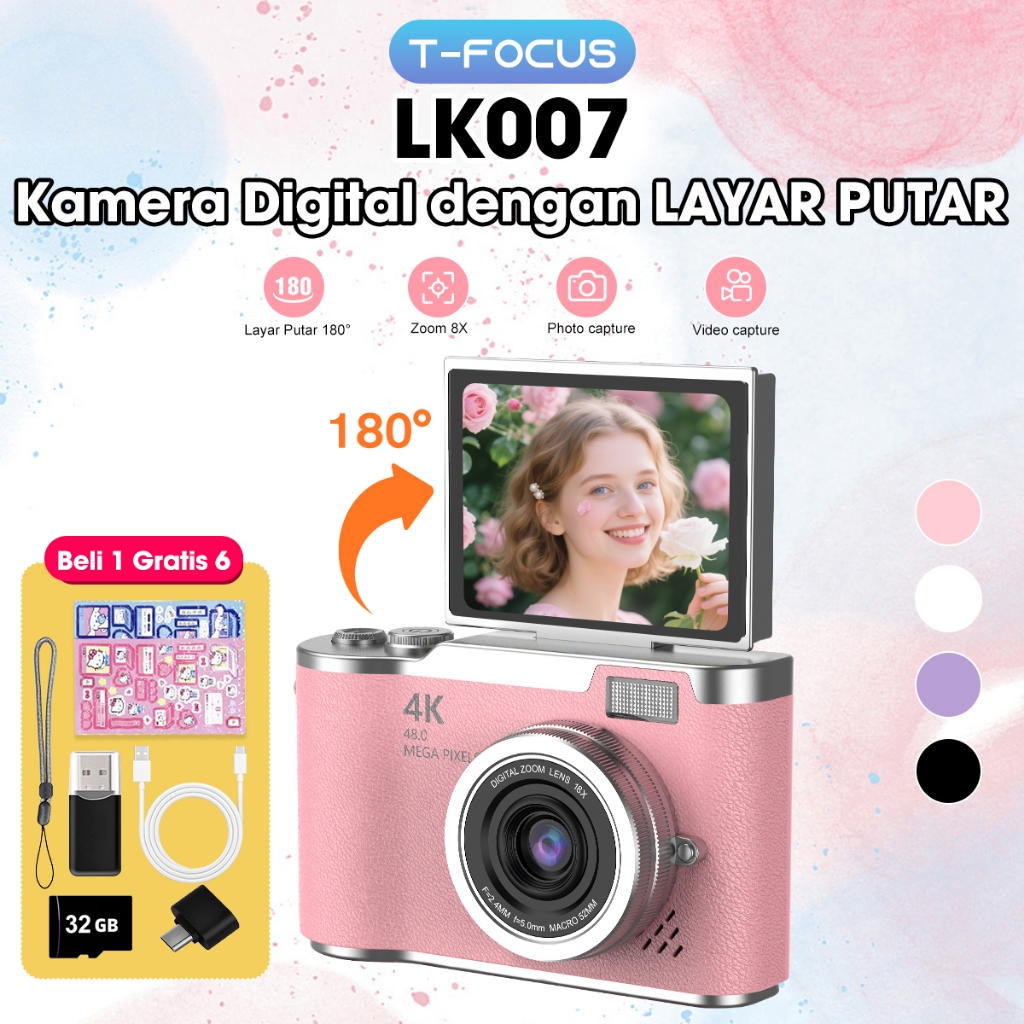 T-FOCUS Kamera Digital Layar 2.4 Inci Zoom Digital 8x Layar Putar 180° 4K Kamera Vlog Include Kartu Memori 32GB - Hadiah untuk Pemula Remaja LK007