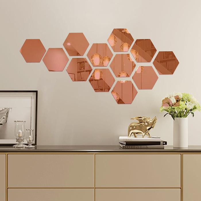 METH 12 PCS MEDIUM HEXAGONAL MIRROR STICKER HONEYCOMB ACRYLIC KACA CERMIN - GOLD