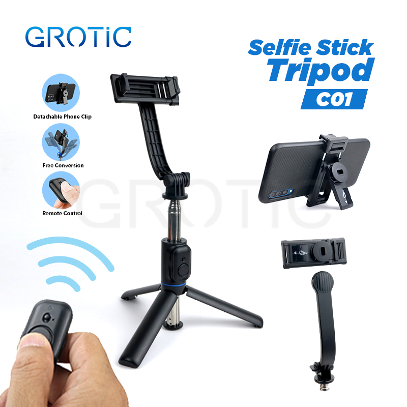 Grotic Tripod Handphone Remote Bluetooth Dengan Lampu Klip Telepon Dapat Dilepas Tongsis Hp C01