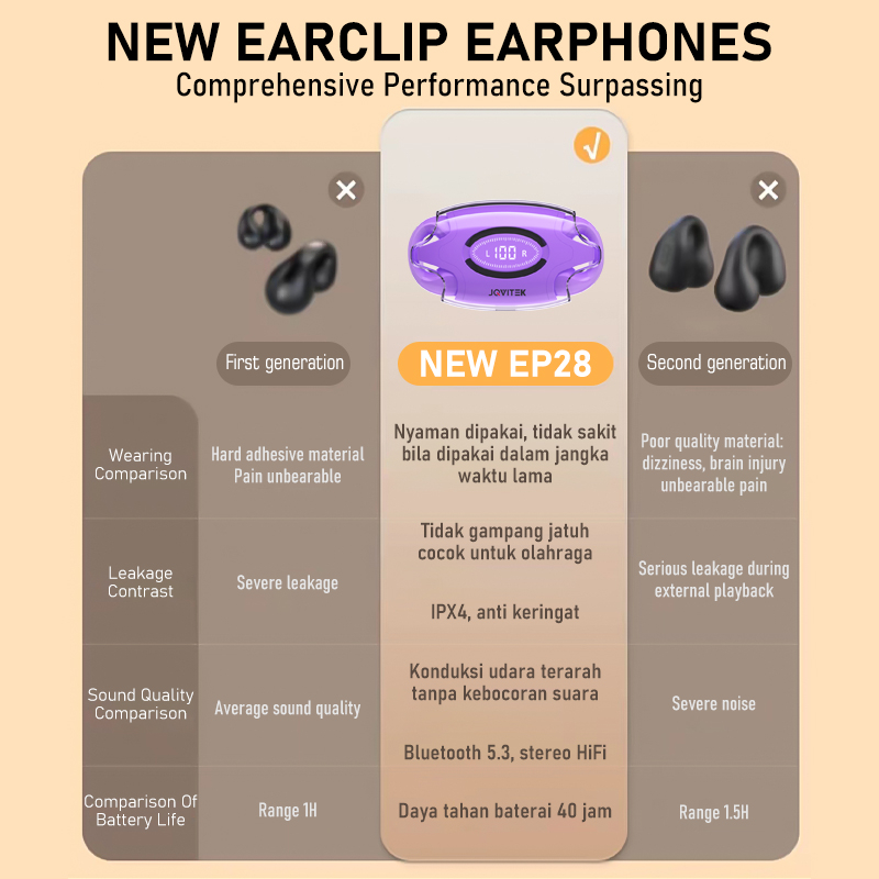Jovitech Ep28 Original Wireless Ear Clip Earphone Bluetooth 5.3 Tws Ear Clip Headset Design Touch Sports Digital Display