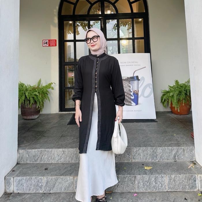 Ayunda Tunik Muslim Kancing Panjang Melayu Wanita Pollo Linen - Ayunda Broken White, Standar Ld 110