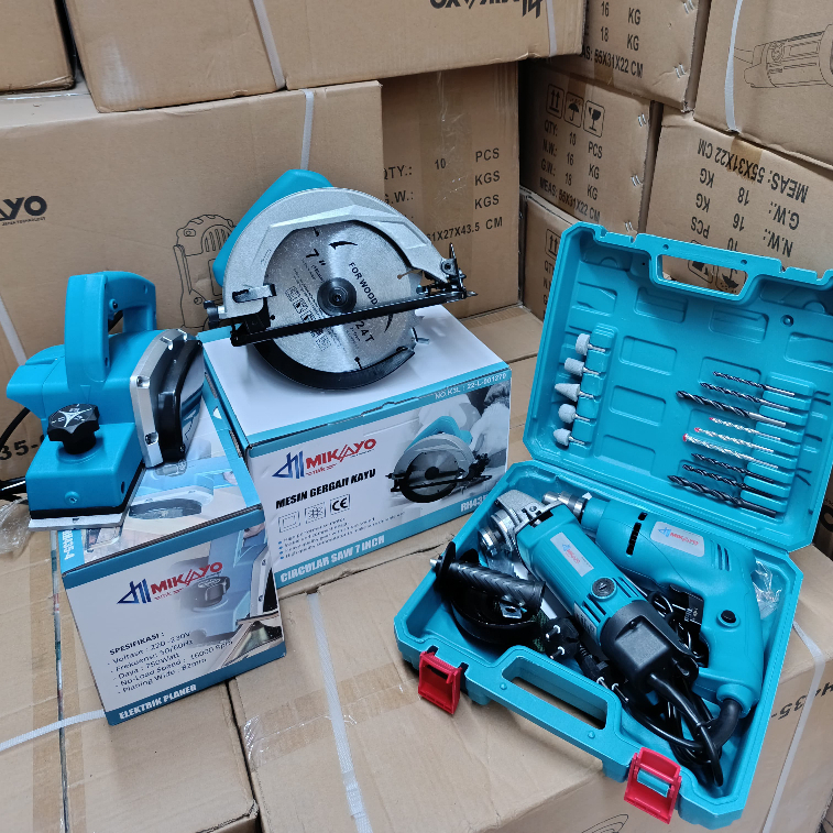 [4 ITEM] Paket Tukang kayu lengkap Mesin Planer+ Mesin Gerinda Tangan/Listrik + Mesin Circular Saw/Circle +Mesin Bor 10 MM Variable