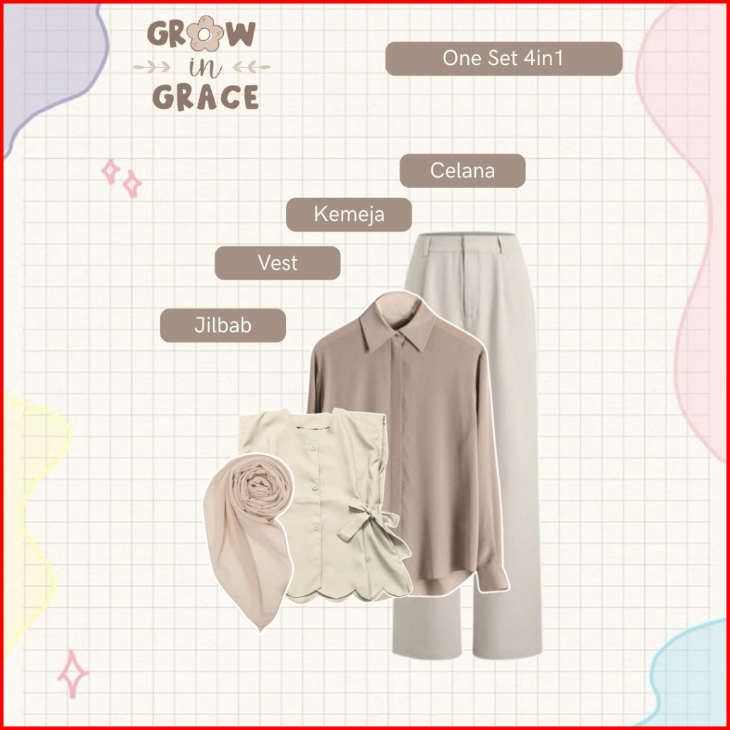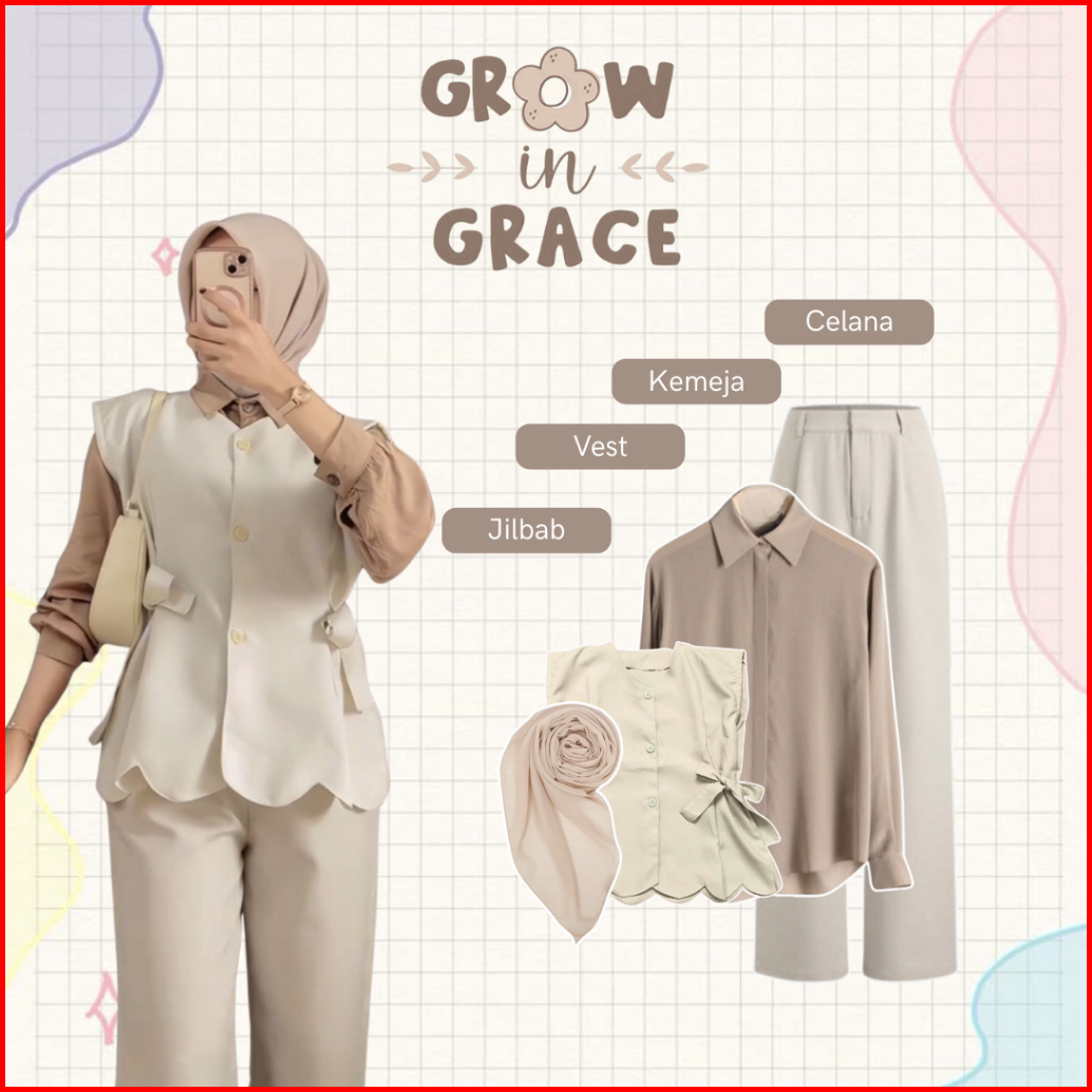 Outfit Ngopi One Set Wanita Kekinian Vest Kemeja Celana Jilbab Setelan Cewek - Bu69n