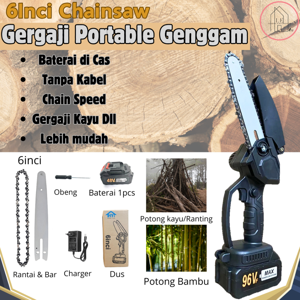 LS Gergaji Listrik Mini Chainsaw Listrik Tanpa Kabel Gergaji Listrik Genggam 96v Memotong Kayu