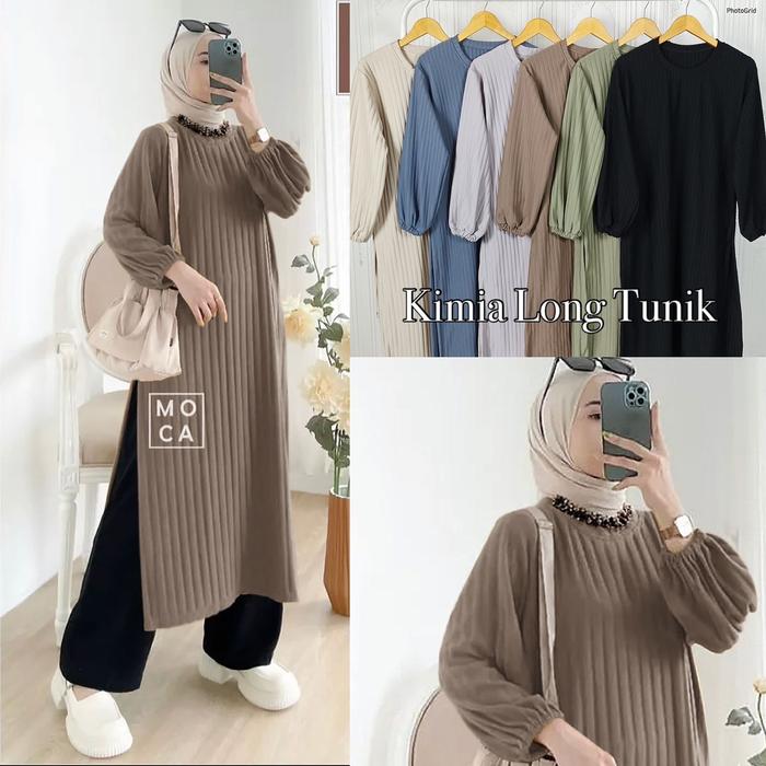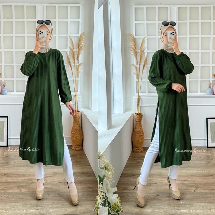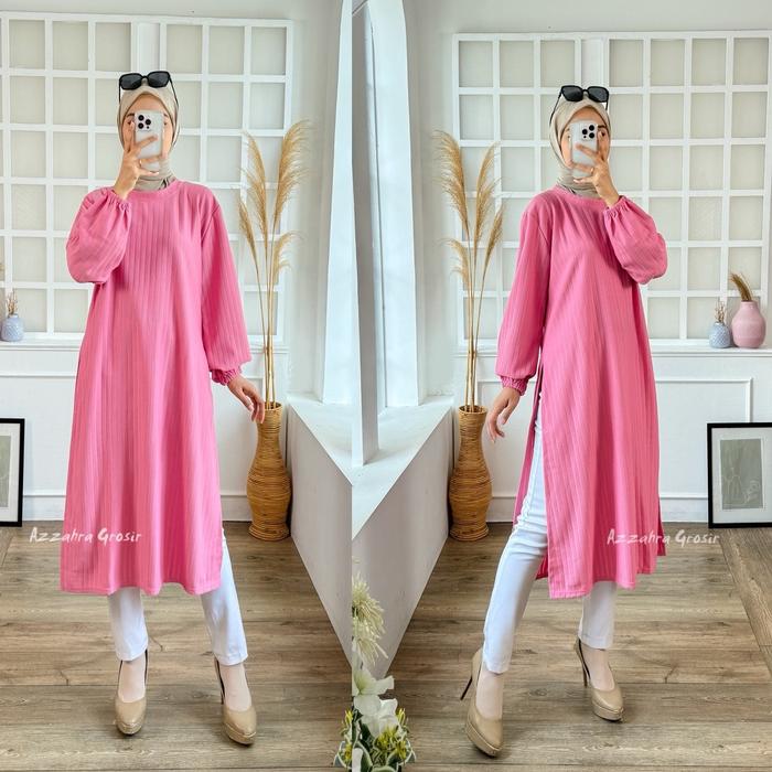 Azzahra Grosir - Kimia Long Tunik Wanita Panjang Knit Belah Samping Tania Tunik Atasan Muslim Kaos Tangan Balon - Blue G