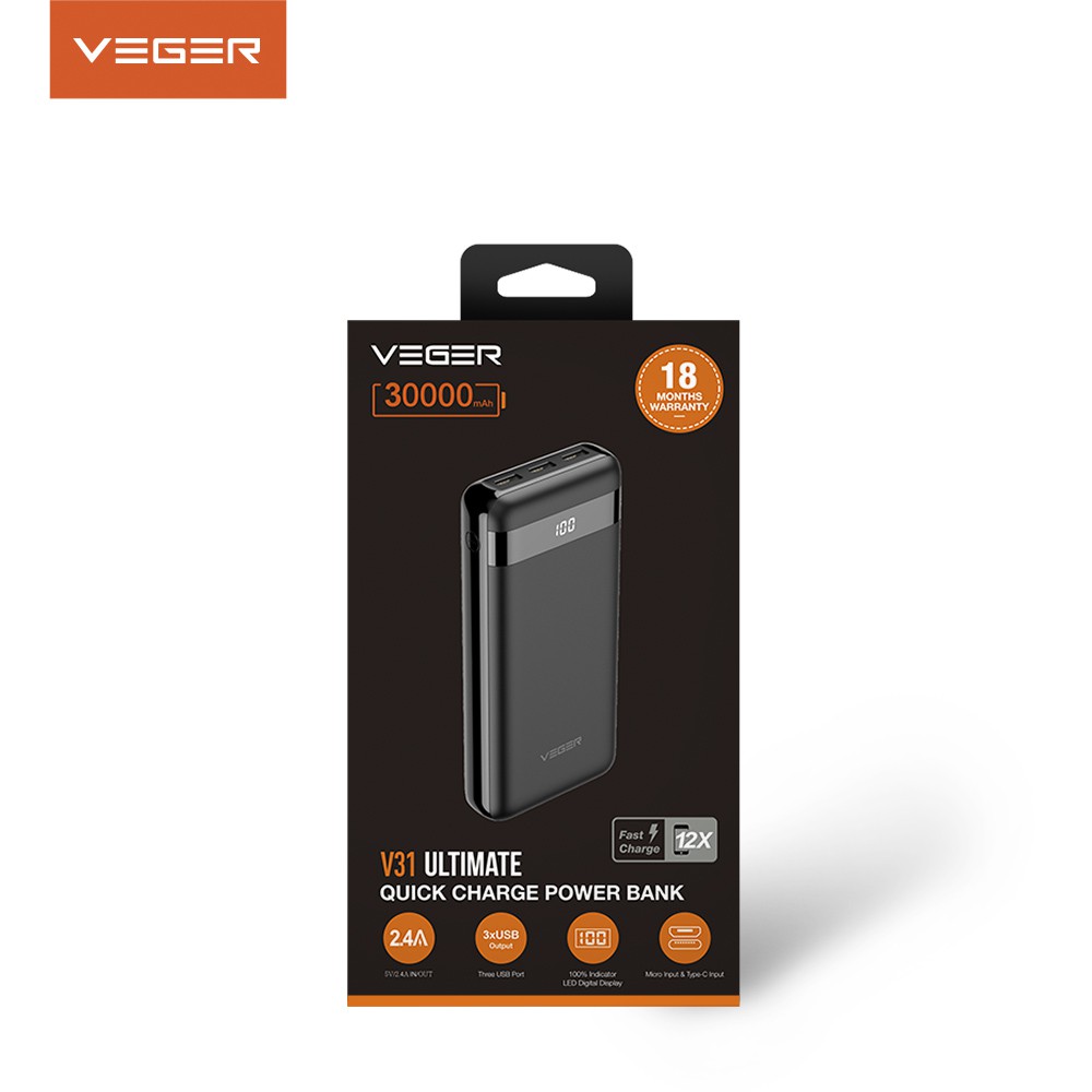Powerbank Power Bank Veger V31 30000Mah 3 Ports Usb Output 2.4A Led Digital Display