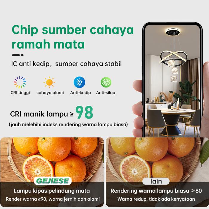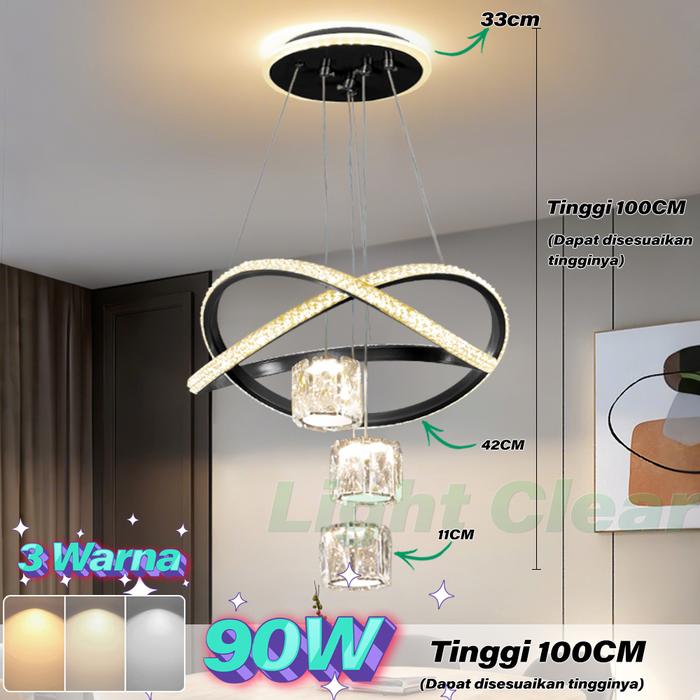 Lampu Gantung Kristal Mewah 3Warna 90W LED Lampu Gantung Ruang Tamu Minimalis Kamar Tidur Hias - Hitam+Remote