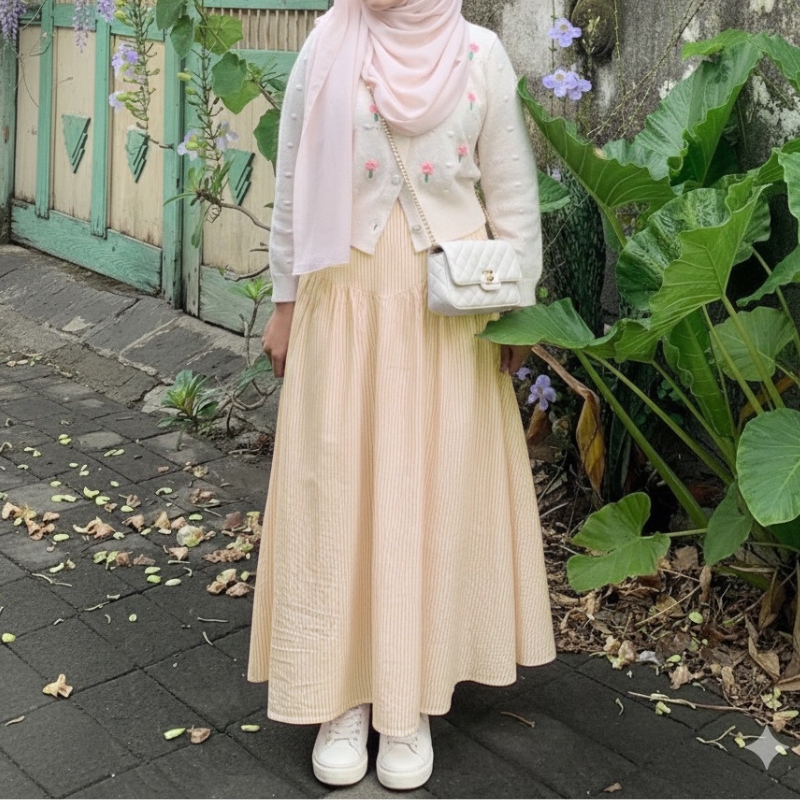 FioraRokWanitaStripedKatunAdemMaxiPanjangCasualBasicCottonYeorinSkirtKoreanStyle
