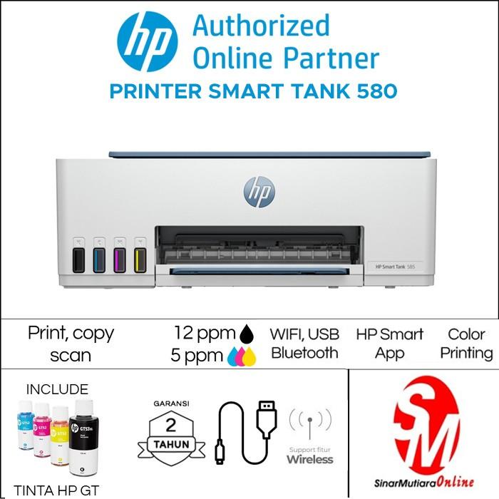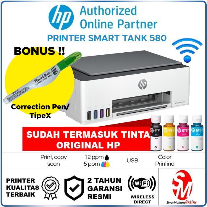 HP Printer Smart Tank 580 All-in-One Print Scan Copy Wireless Hitam Putih Bonus Tinta Original
