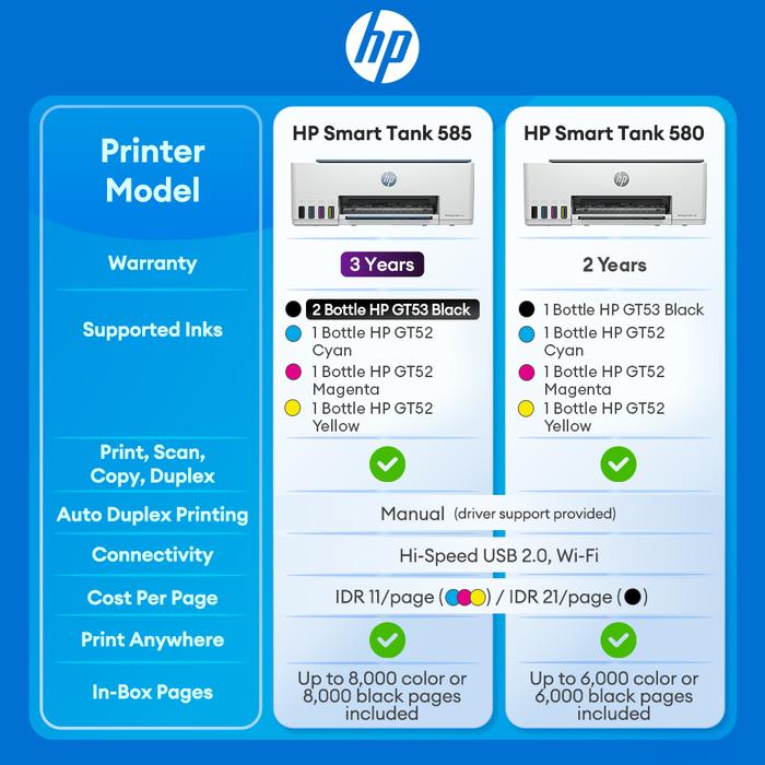 Printer HP Smart Ink Tank 585 All in One Print Scan Copy Wireless Color Colour Warna Garansi Hingga