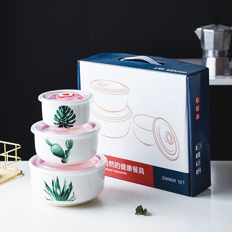 MANGKOK SAJI SET CERAMIC TABLEWARE ISI 3 DENGAN PENUTUP MANGKOK LAUK BOX PENYIMPANAN MAKANAN