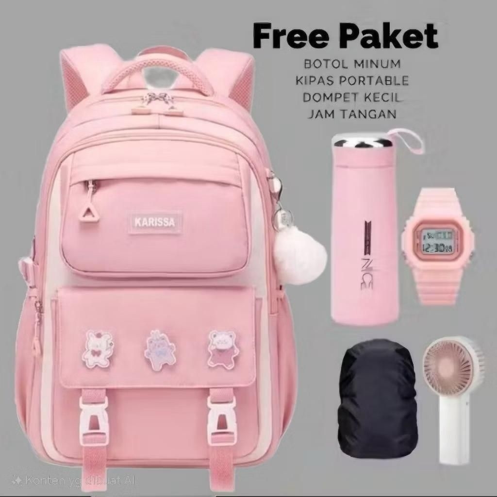 Tas Ransel 5in1 Kharissa Ransel Anak Sekolah Perempuan SD SMP SMA Free Botol Minum+Jam+Raincover+Kipas