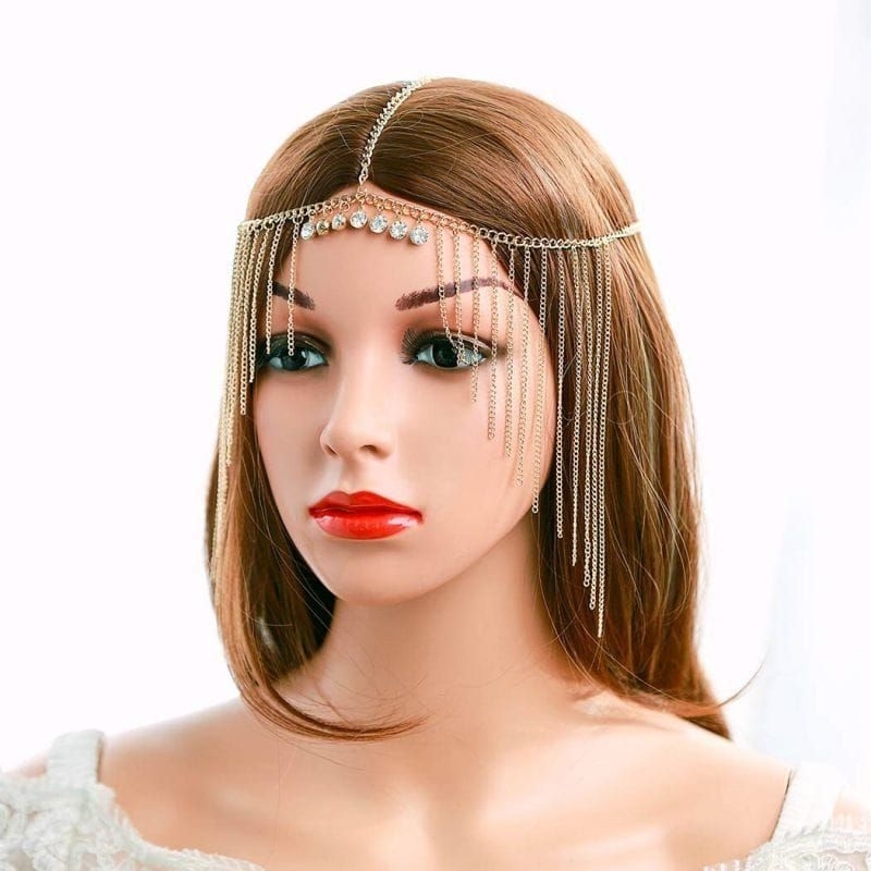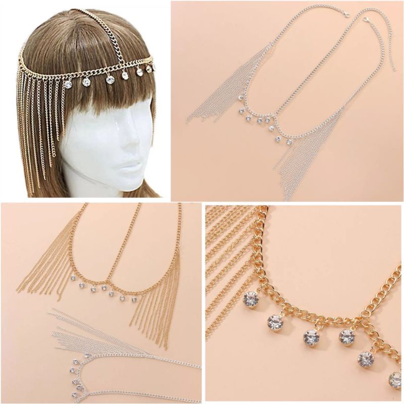 BIN-06 Headpiece bindi rumbai mesir kuno putri cleopatra warna silver dan kuningan mengkilap kuningan mengkilap hiasan dahi headchain rantaii model hindi