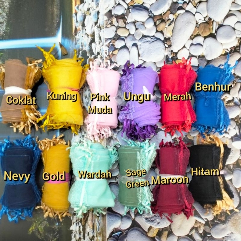 Hitam , Putih , Merah , Maroon, Hijau muda , Hijau tua , Pink muda , Pink tua , Ungu, Tosca , Nevy , Biru muda, Cream , Sage green , Coklat, Kuning , Milo