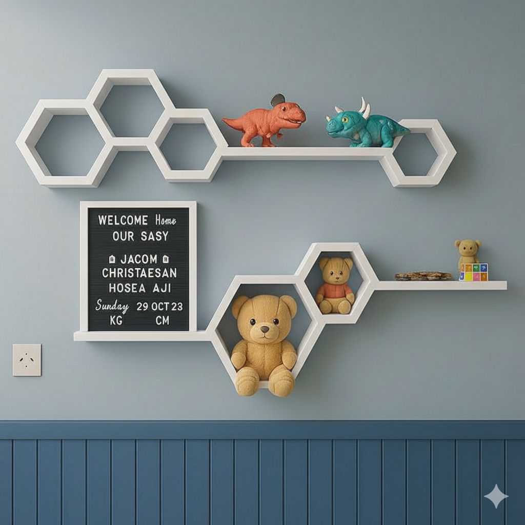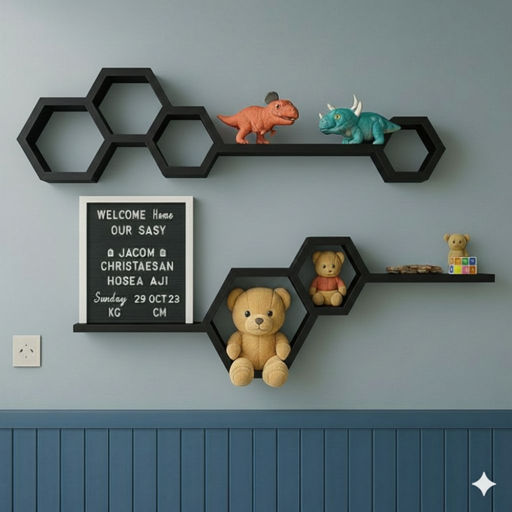 Rak Dinding Hexagonal Aestetic Satu Set Kayu Jati Belanda