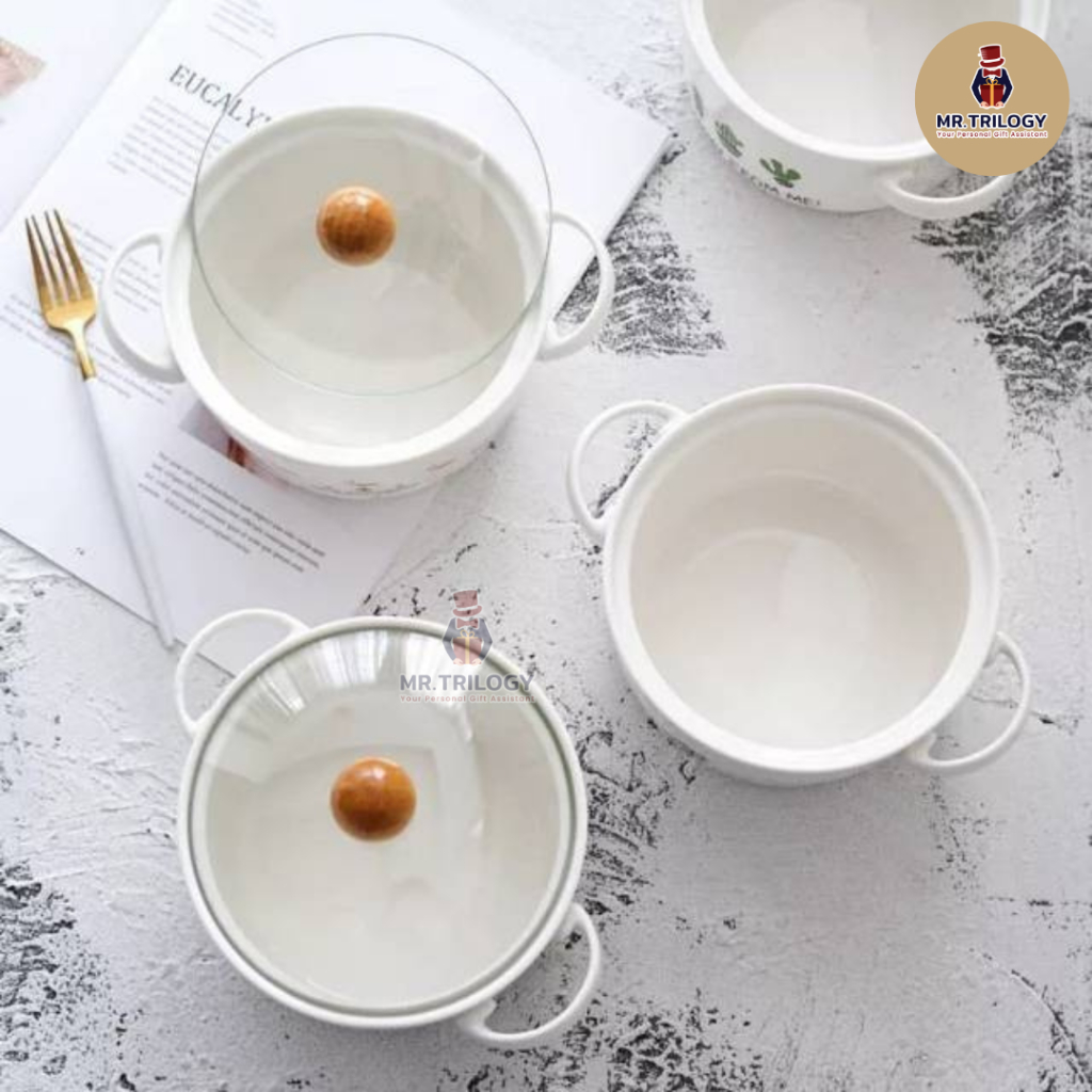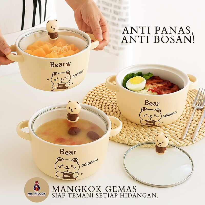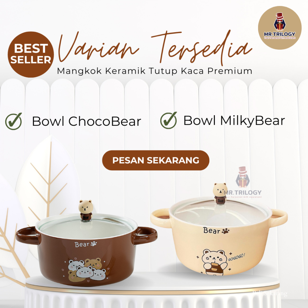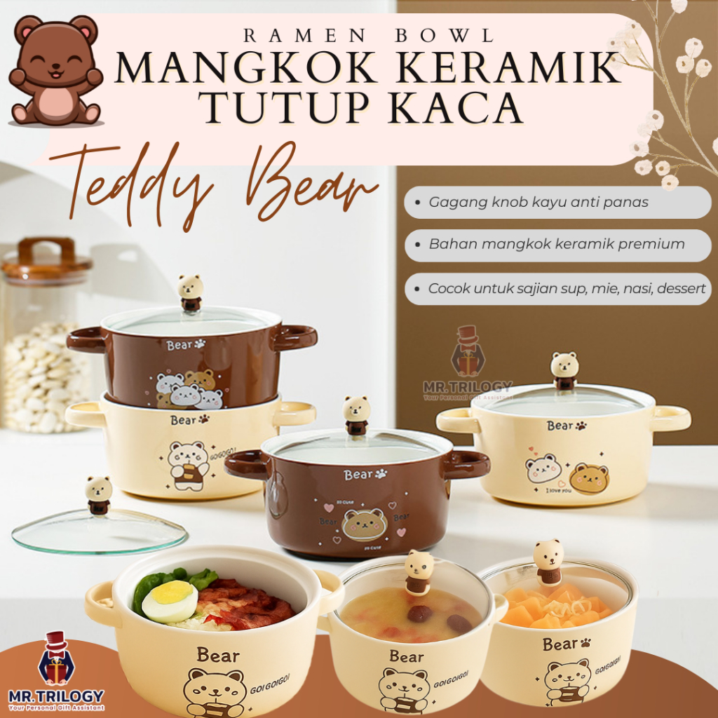 Mangkok Keramik Tutup Kaca Premium Cantik Motif Bear Multifungsi Sajian Mie Ramen Korea Tahan Panas