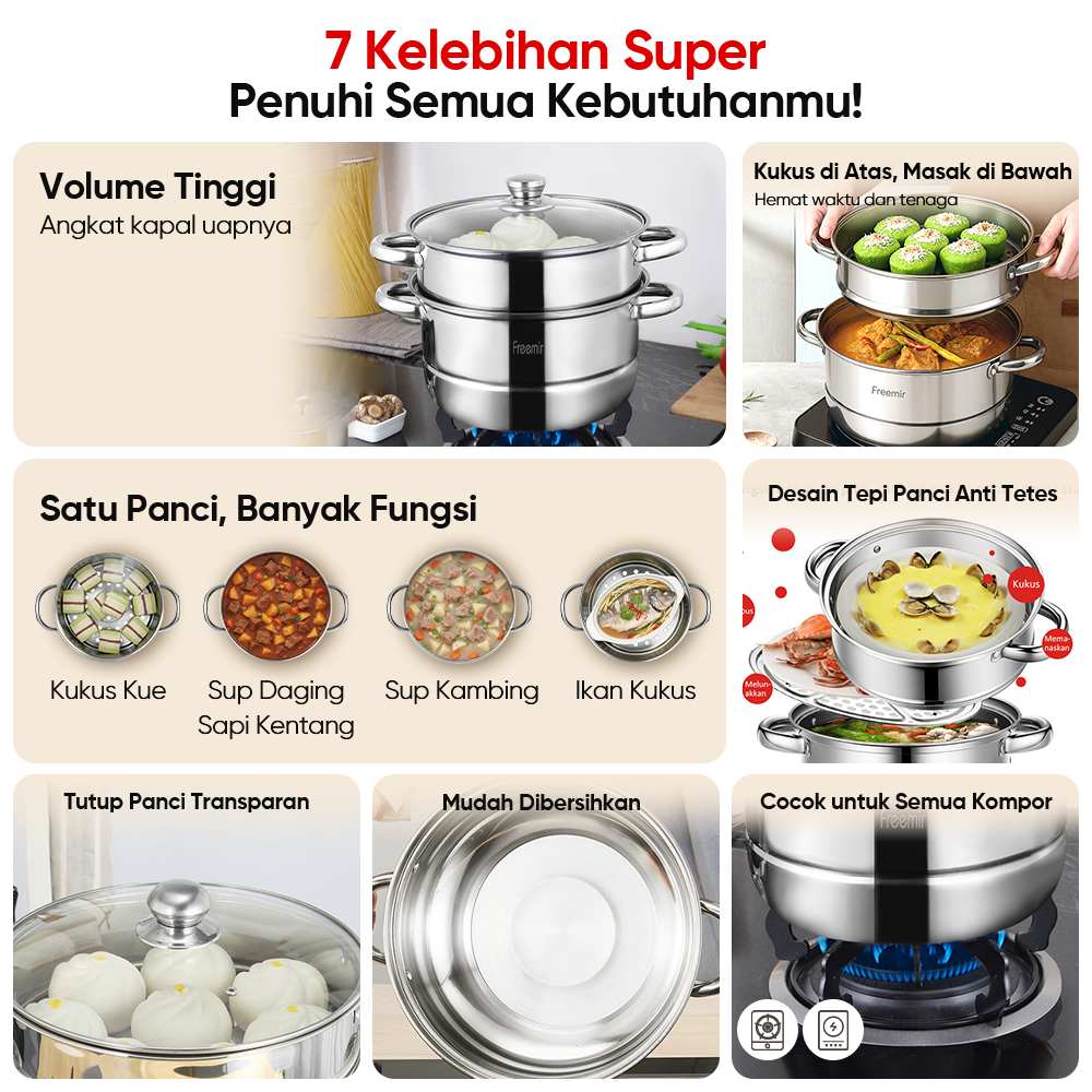 freemir lifestyle Panci Kukus Stainless Steel 3/2 Tingkat Panci Rebus Steamer Serbaguna Anti Karat Cocok untuk mengukus ikan dan nasi