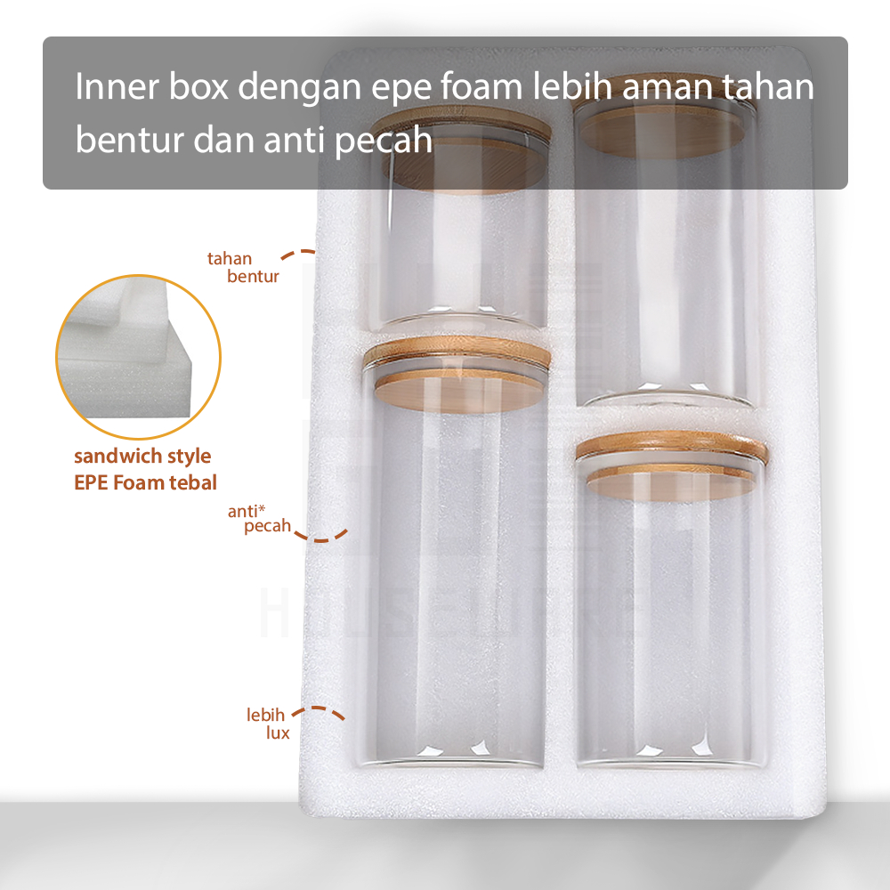 HUGO Toples Kaca Set 4 Pcs Toples Kue Kedap Udara Tutup Bambu Premium Quality Toples Kaca Borosilicate Tahan Panas