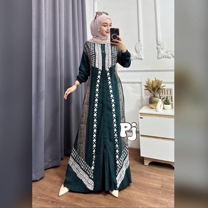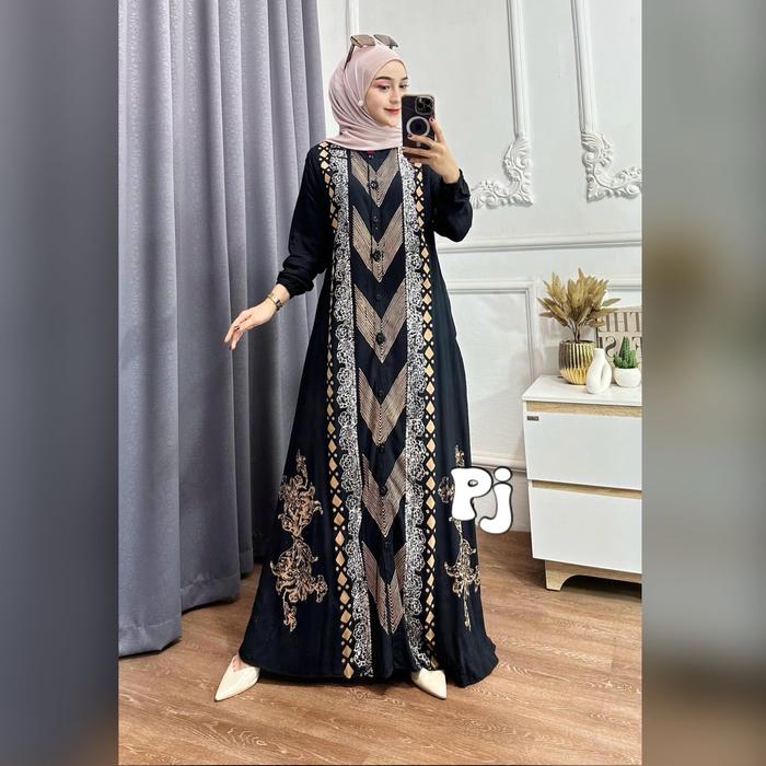 Gamis Batik Cap Bahan Rayon Twill Muslim Wanita Cantik Gamis Cap Malaman Full Kancing Tanpa Layer - Abaya Hitam, M