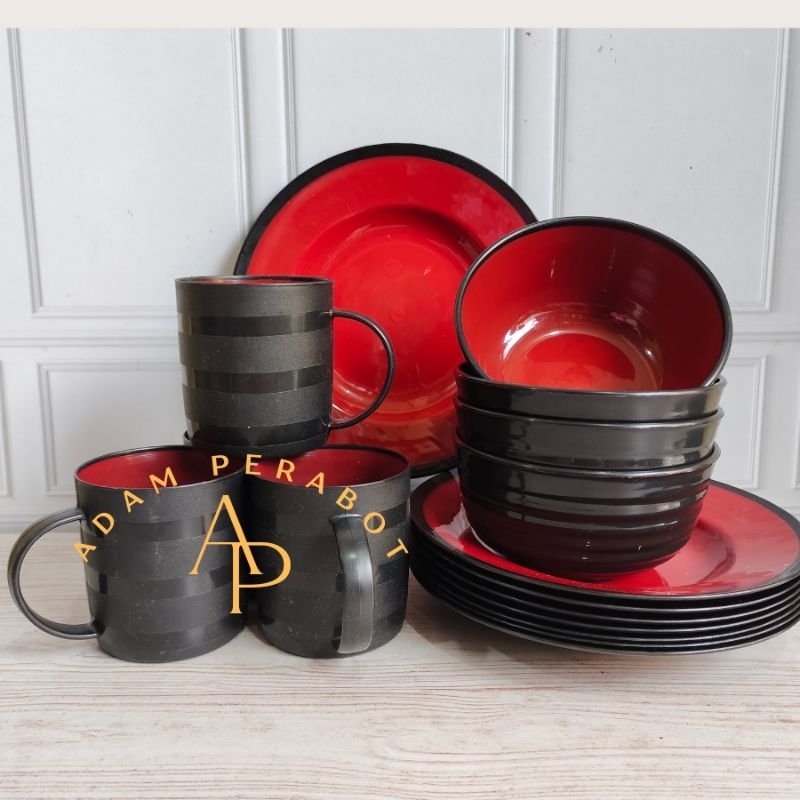 PAKET LENGKAP 1 SET MODEL RAMEN ULIR HITAM MERAH CANTIK 12 PCS PIRING, MANGKOK, GELAS SERBAGUNA TAHAN PANAS ANTI PECAH