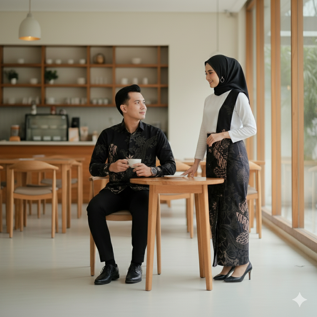Galeri Batik Ardev - Couple Sarimbit Rok & Kemeja Reguler Warna Hitam Bahan Katun Motif Peksi Seling