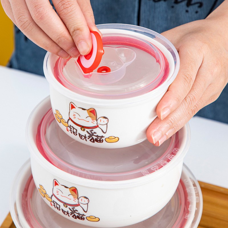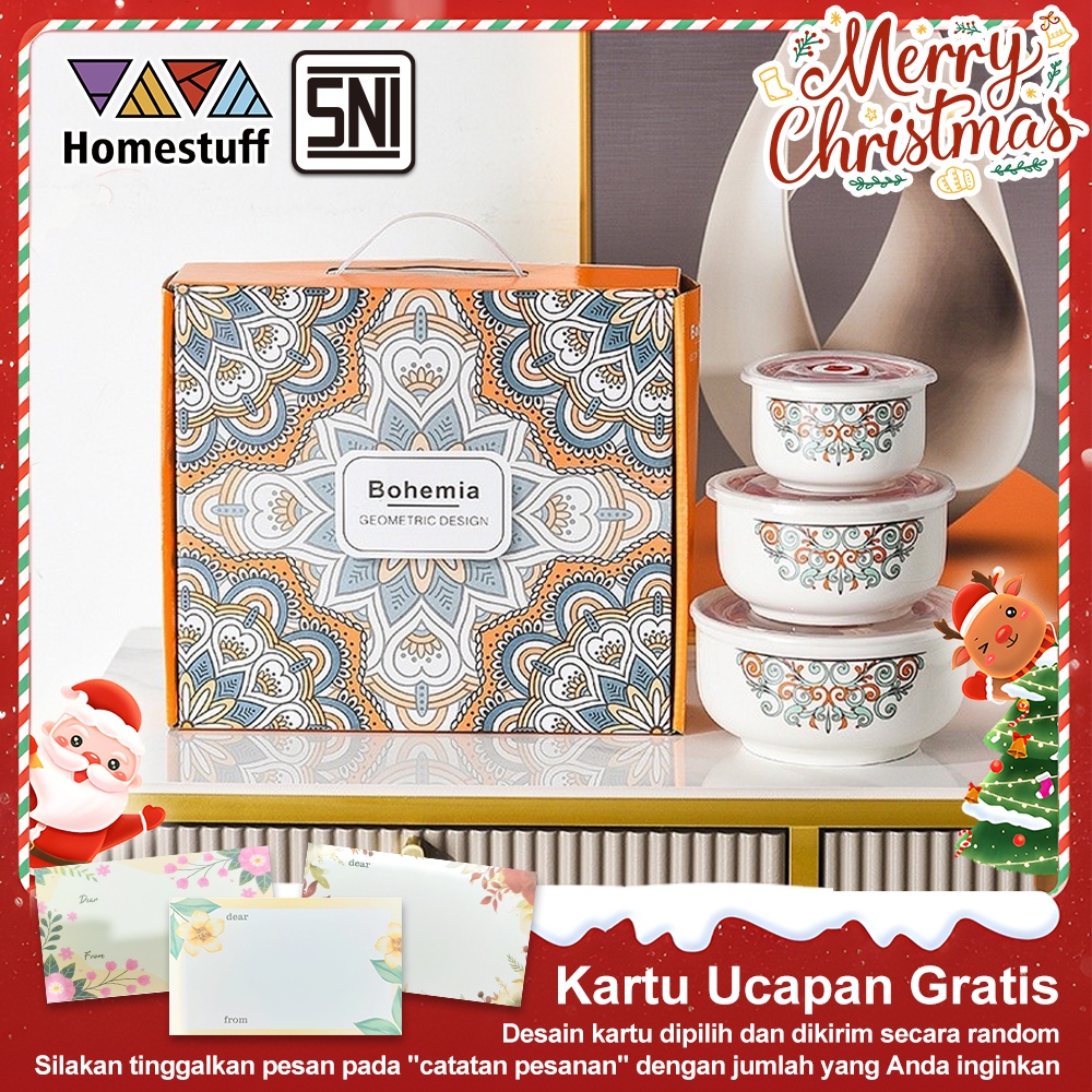 HOMESTUFF Set Mangkuk Keramik 3 Tingkat Aneka Motif / Hampers Mangkuk Keramik 3 Ukuran / Penutup Kedap Udara / Garansi