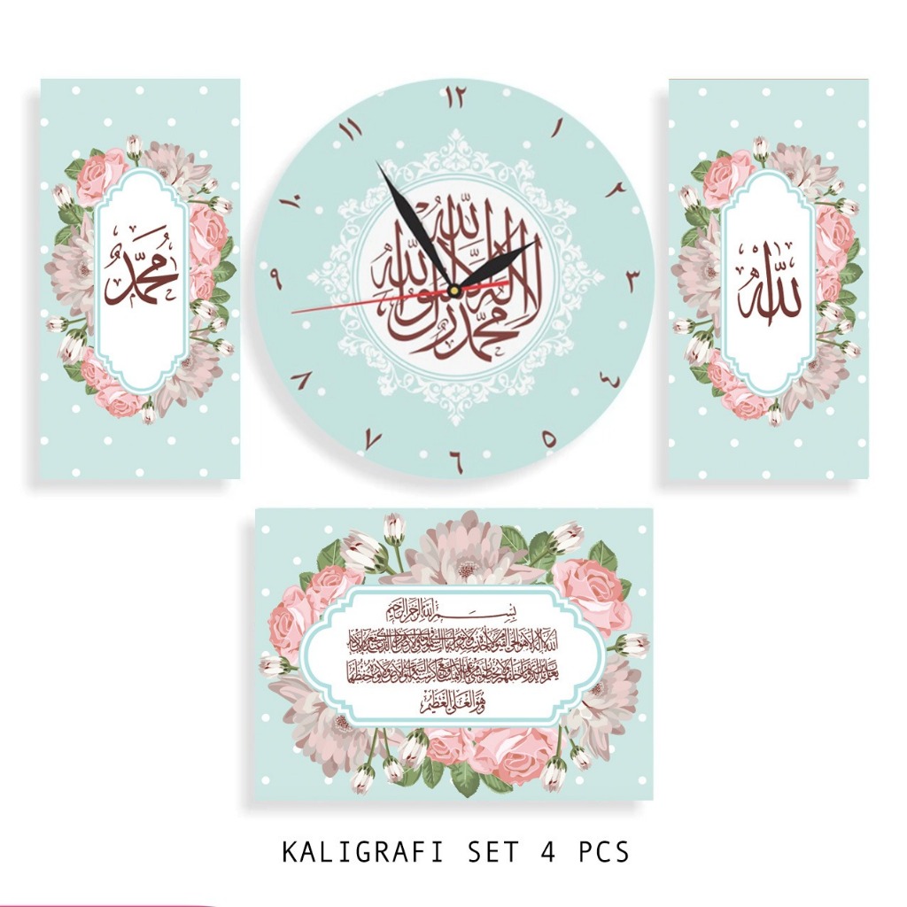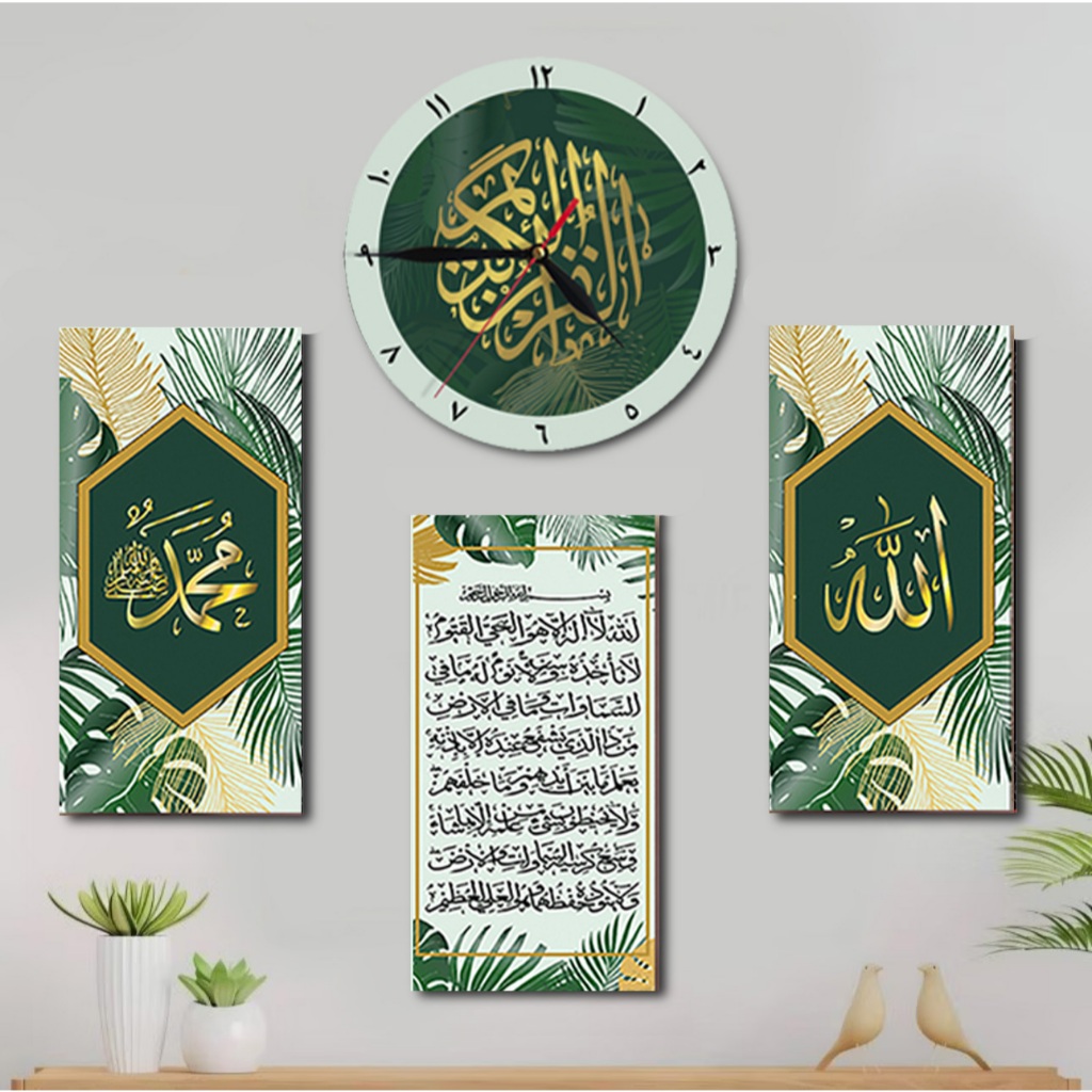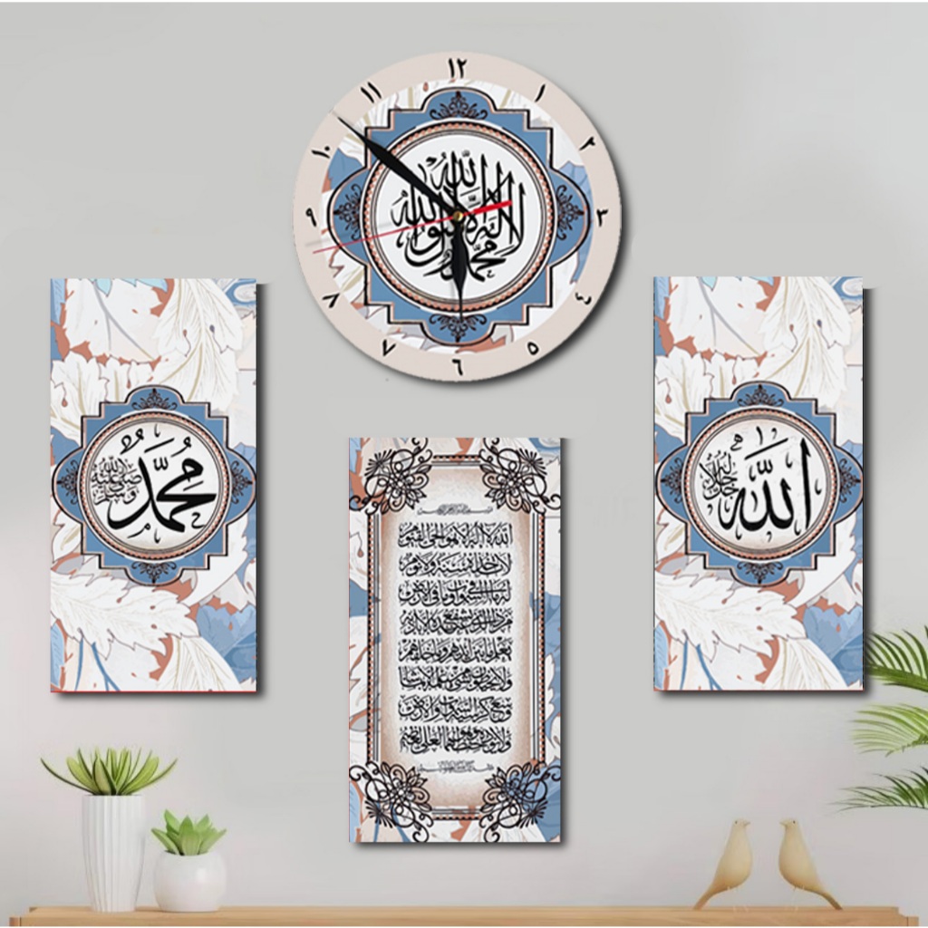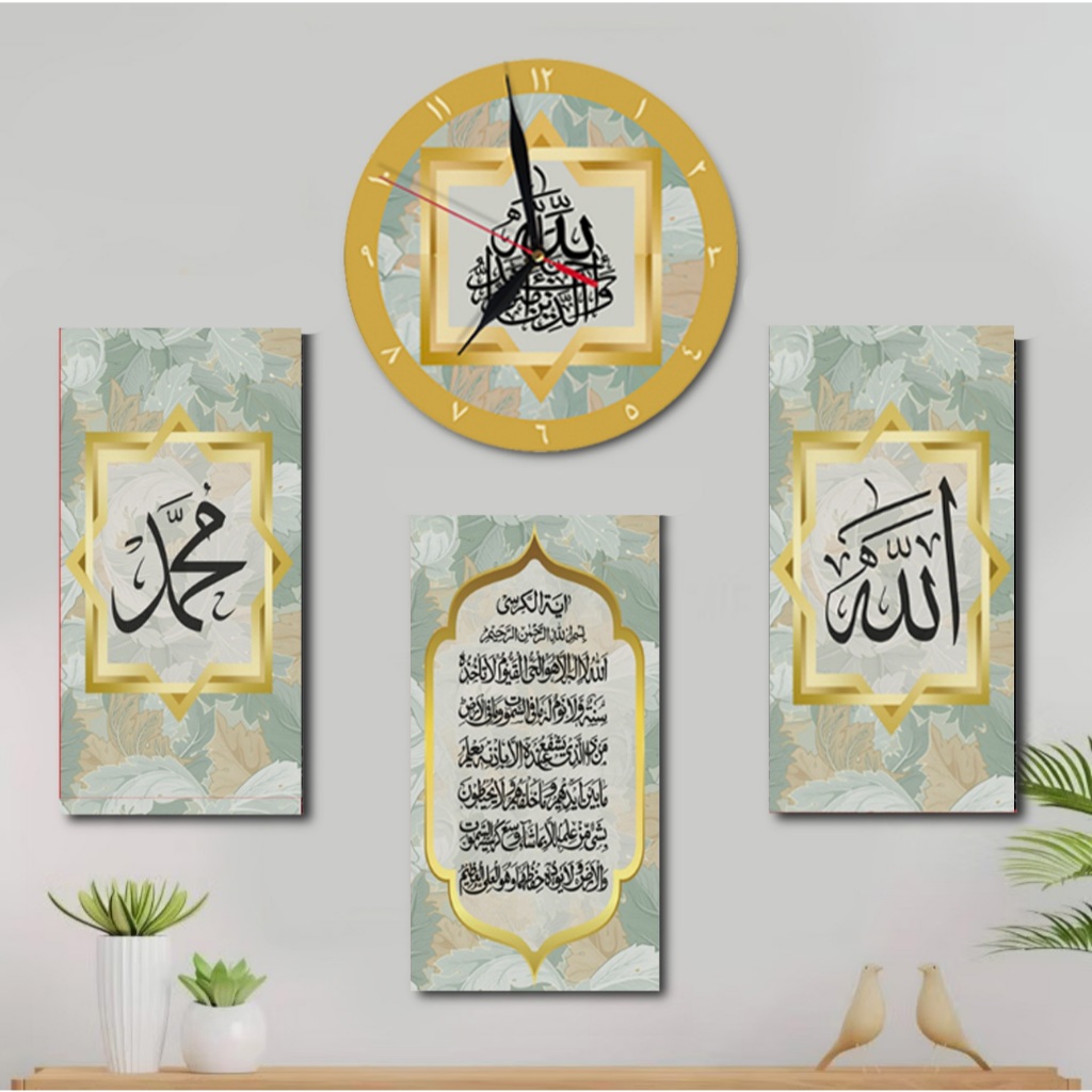 Set Jam Dinding & 3 Panel Dekorasi Islami Kaligrafi Ayat Kursi Hiasan Ruang Tamu Aesthetic