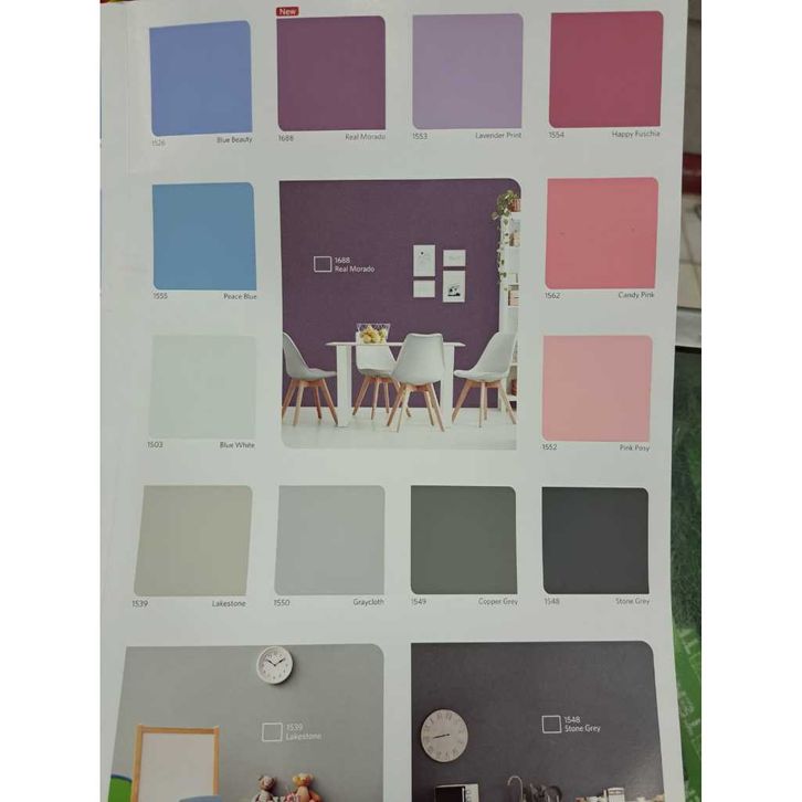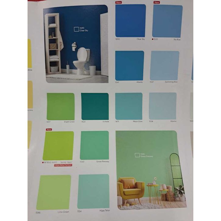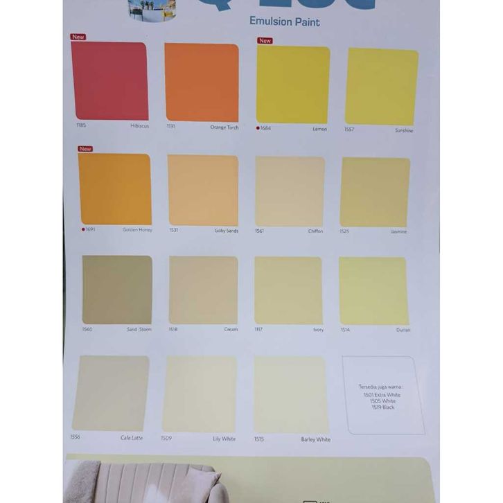 1117 Ivory, 1154 Hijau Telor, 1185 Hibiscus, 1505 White (PASTEL), 1509 Lily White, 1514 Durian, 1515 Barley White, 1518 Cream, 1525 Jasmine, 1526 Blue Beauty, 1531 Goby Sands, 1533 Sky Blue, 1534 Marina, 1540 Green Freeway, 1546 Lime Green, 1547 Swimming Blue, 1556 Caffe Latte, 1557 Sunshine, 1560 Sand Storm, 1561 Chiffon, 1671 Moon Glow, 1684 Lemon, 1690 Clear Sky, 1691 go-lden Honey, Extra White (Cream)