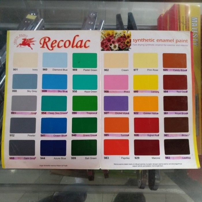 901 IVORY, 902 CREAM, 908 PINK, 922 go-ldEN YELLOW, 925 CANDY BROWN, 927 ORCHID VIOLET, 928 SIGNAL RED, 929 MAROONE, 939 SKY BLUE, 940 GRASS GREEN, 941 OCEAN BLUE, 944 AZZURE BLUE, 950 AQUA GREEN, 952 PEWTER, 960 DIAMOND BLUE, 961 BROWN, 980 LEMON, 981 ROYAL BROWN, 982 LEATHER, 983 PAPRIKA, 984 RED OXIDE, 985 SUNRISE, 989 PASTEEL GREEN, 990 TROPICANA, 991 MEADOW FRESH, 993 GREY, 999 BALI GREEN, HITAM, PUTIH