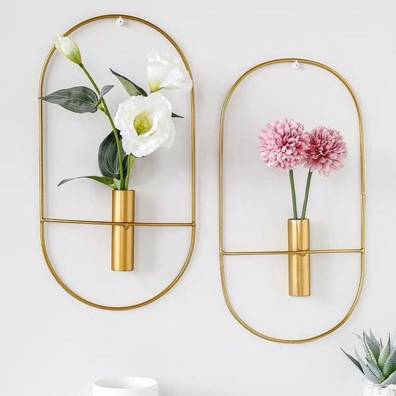 Hiasan Dinding Minimalis Bunga Plastik Bingkai Logam Emas