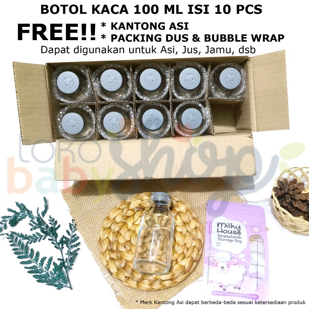 Botol Asi Kaca 100 ML isi 10 PCS FREE Sikat Botol / Ice Gel / Kantong Asi / Corong