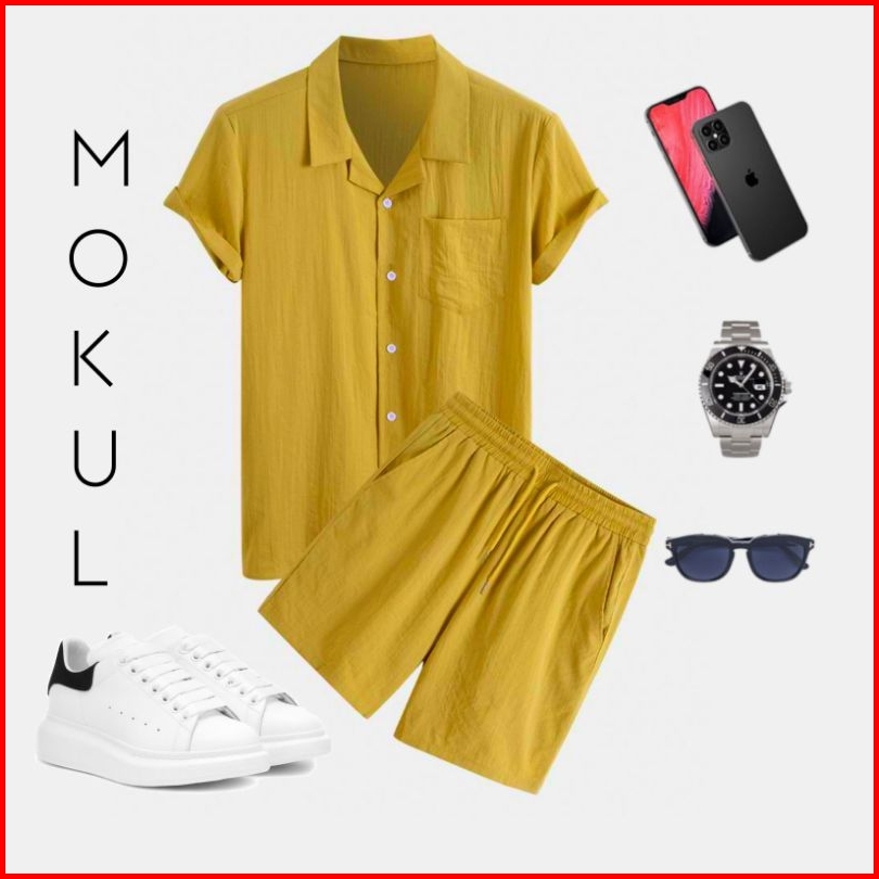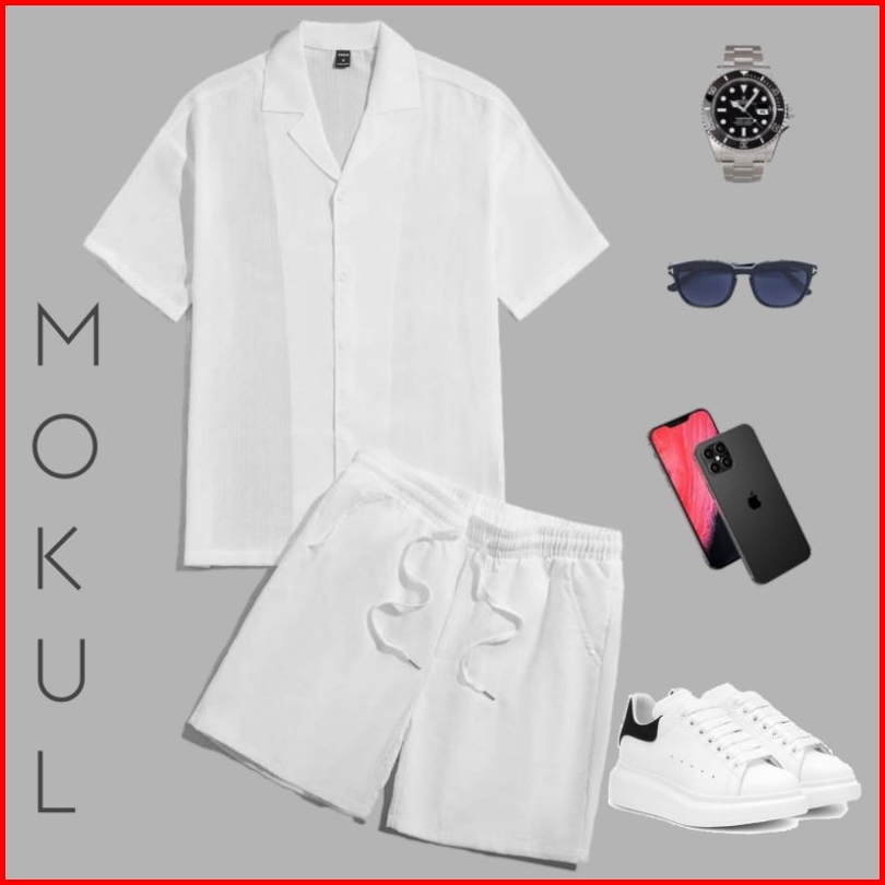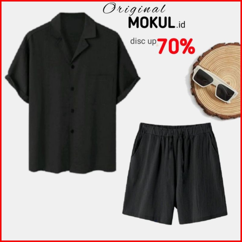 Kemeja Oneset Pria Wanita Korean Style Satu Setel Kemeja Celana Hawai Pantai Free Kalung Mutiara Stylish