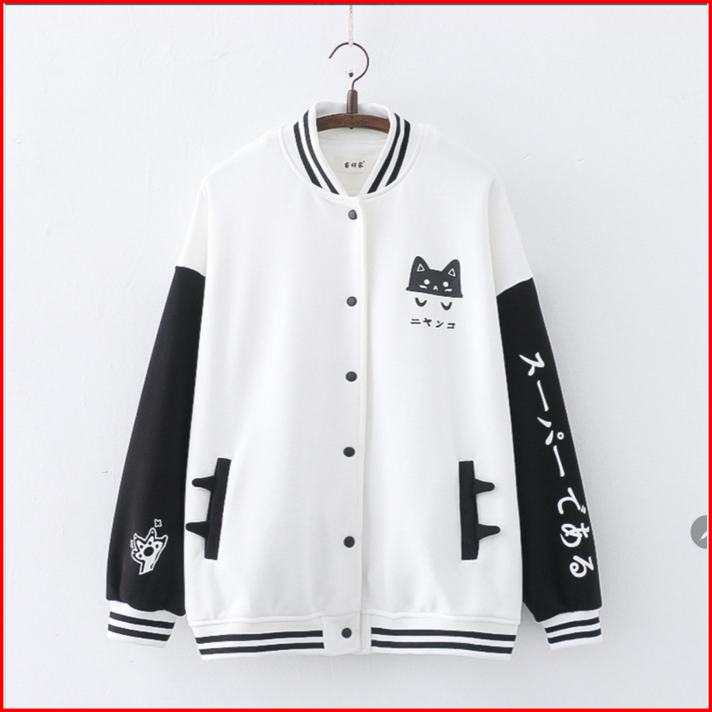 Jacket Varsity Wanita - Meow Cat Jaket Baseball Varsity Wanita Korean Style Kekinian