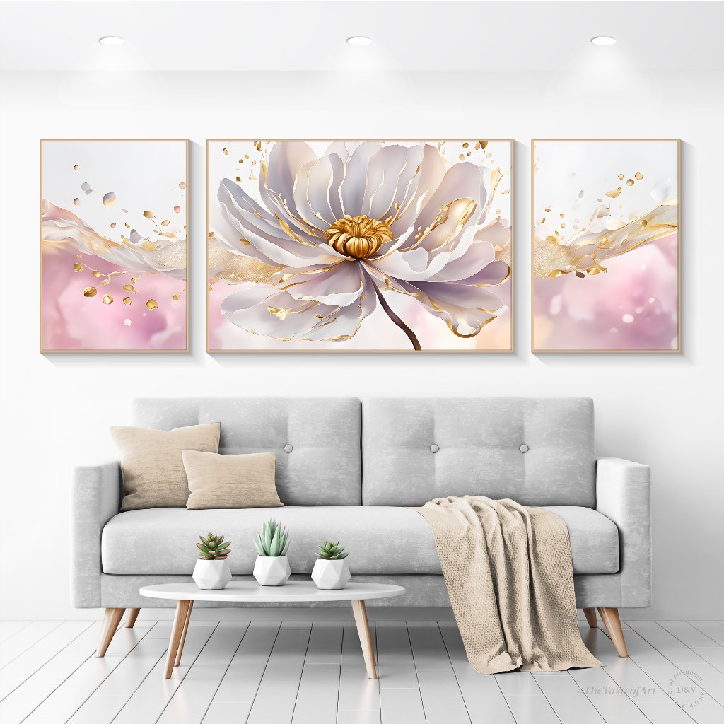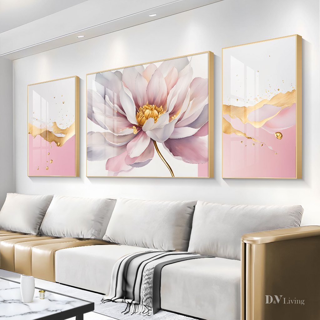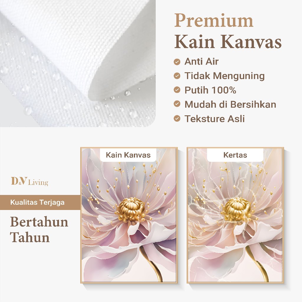 DVLIVING Hiasan Dinding Ruang Tamu Minimalis 80x57cm & 40x57cm Floral Gold Pink INCLUDE FRAME - Wall Decor Bunga Emas Pink Putih Biru Fancy