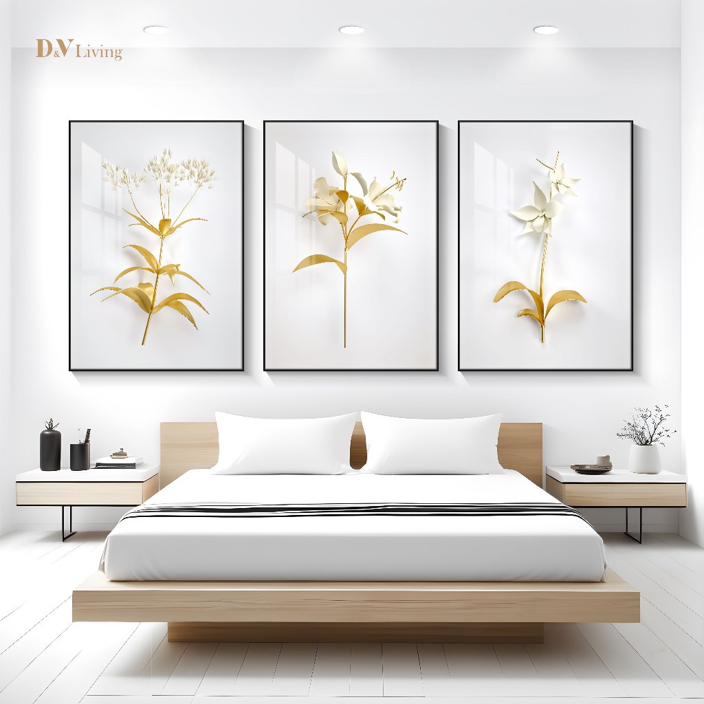 Hiasan Dinding Ruang Tamu Minimalis 80x57cm & 40x57cm Gold White Flower INCLUDE FRAME - Wall Decor FLORAL Bunga Emas Putih Fancy Estetik