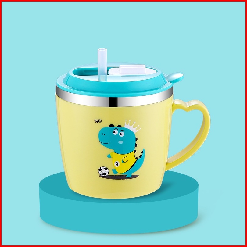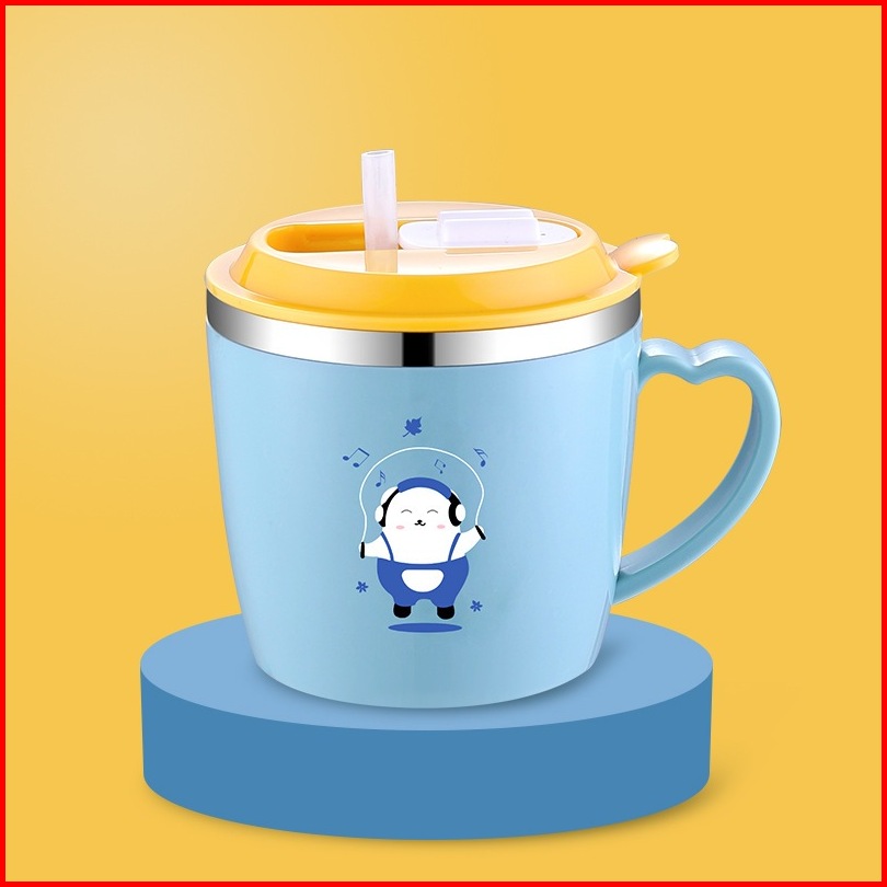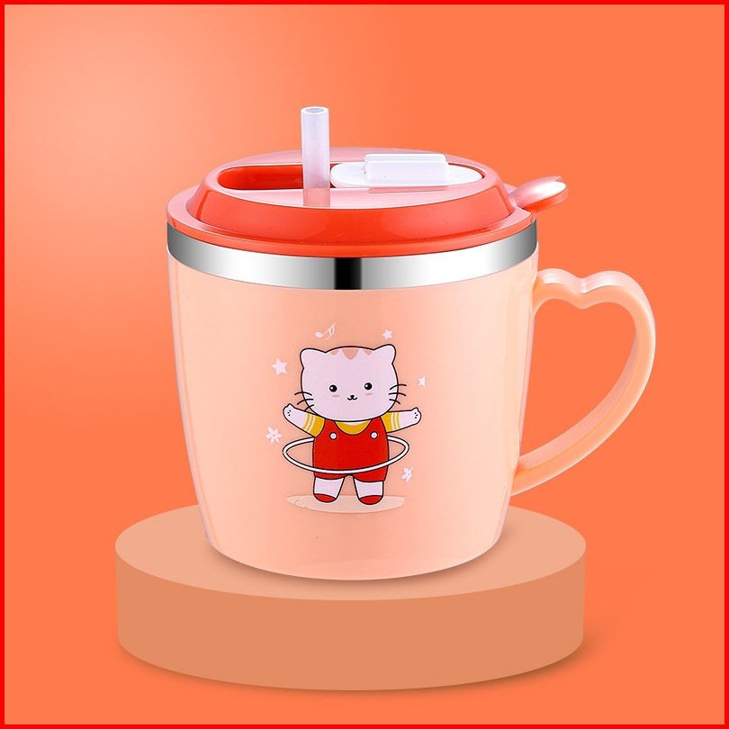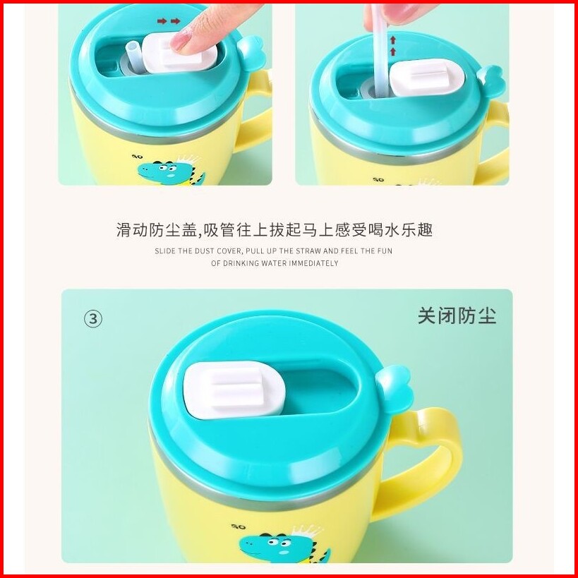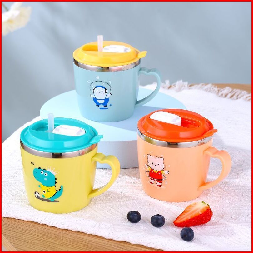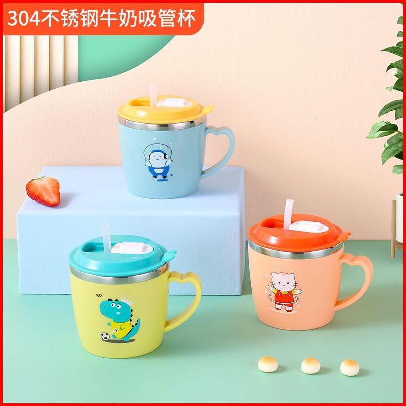Cangkir Mug Stainless 304 Mug Susu Anak Dengan Sedotan Dan Penutup Baja Tahan Karat 300ml