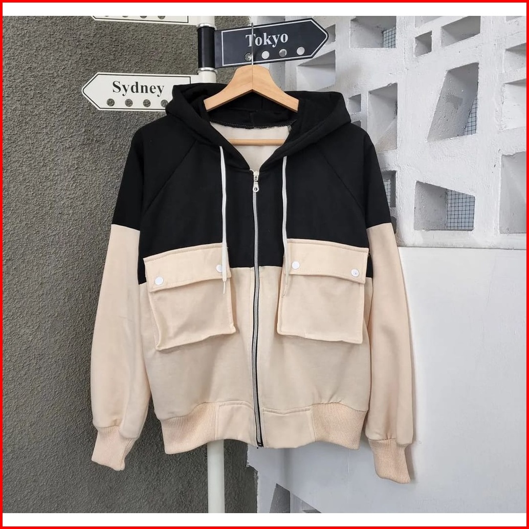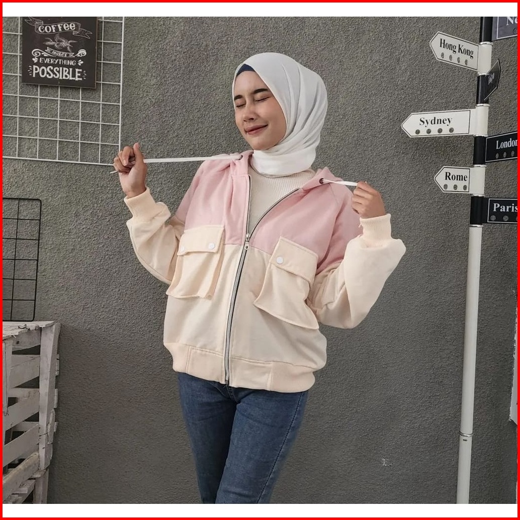 Two Tone Pocket Zipper Jacket Jacket Wanita Bertudung Variasi Oversize