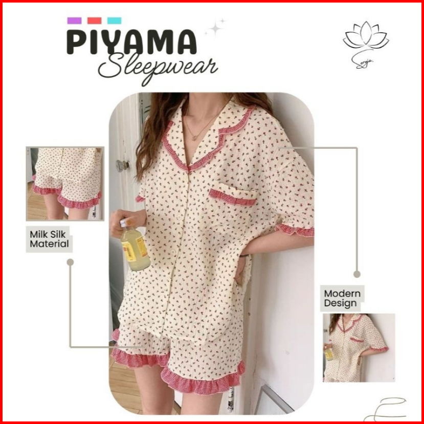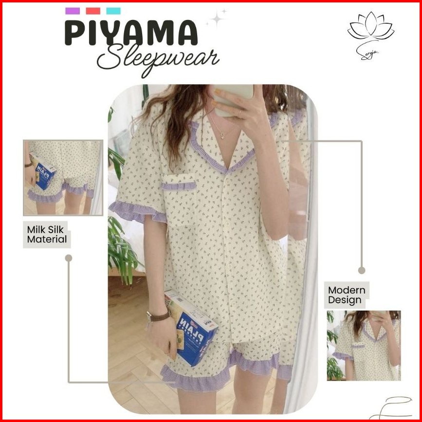 Baju Tidur Wanita Seroja Fashion - Piyama Pajamas Kerah Collar Celana Pendek Bahan Milk Slik Kancing