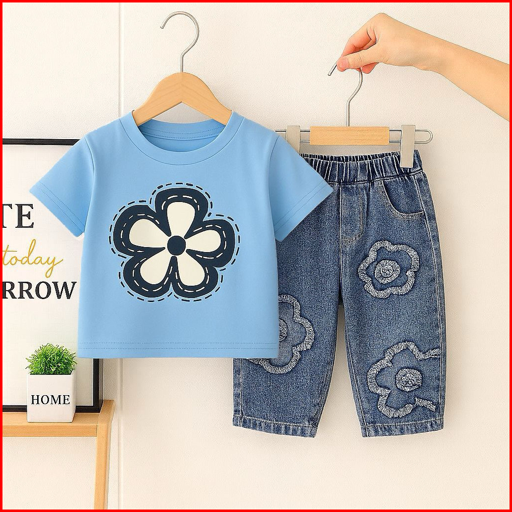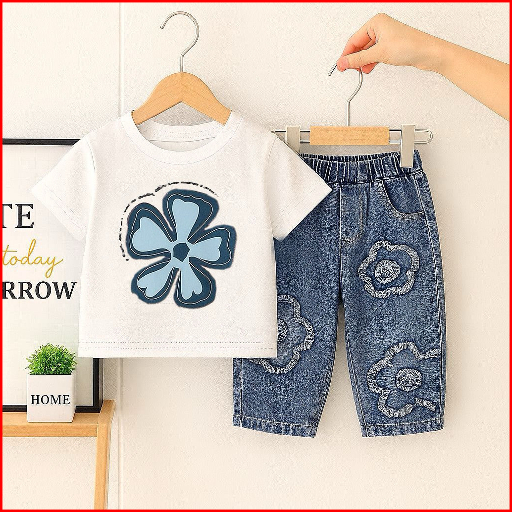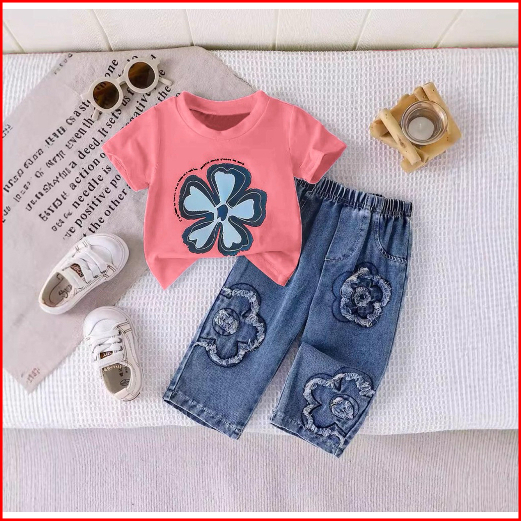 Setelan Anak Baju Anak Perempuan Pakaian Anak Usia 1-5 Tahun Kaos Anak Motif Bunga Celana Jeans Setelan Anak Lucu Setela