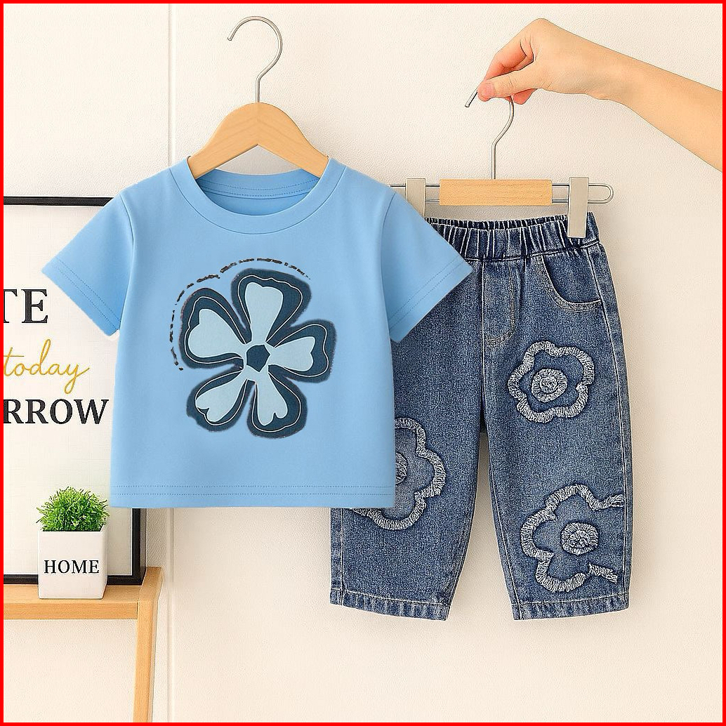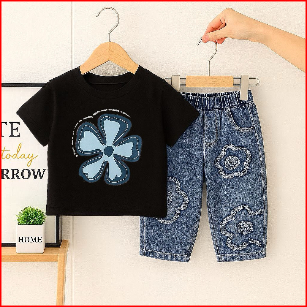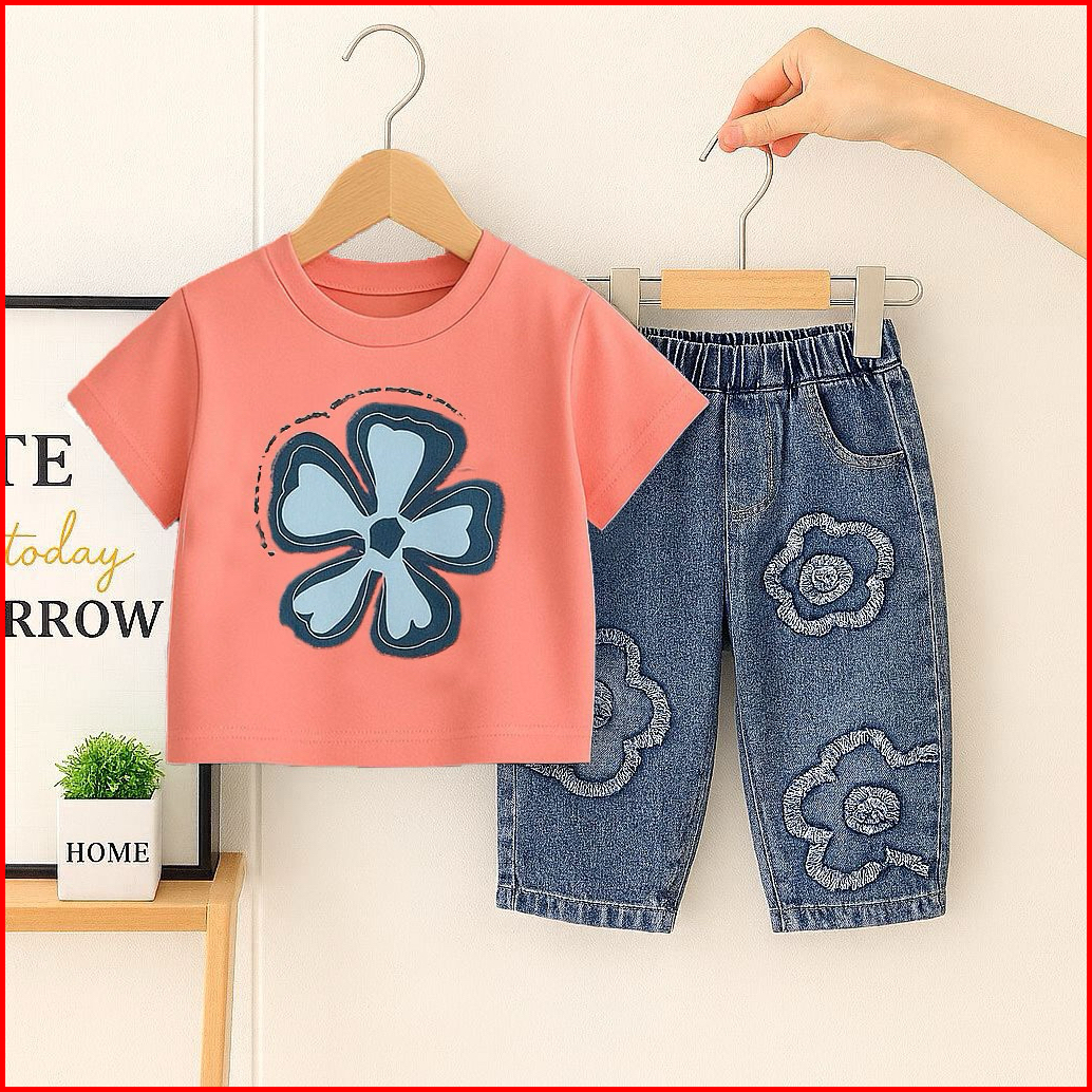 Setelan Anak Baju Anak Perempuan Pakaian Anak Usia 1-5 Tahun Kaos Anak Motif Bunga Celana Jeans Setelan Anak Lucu Setela