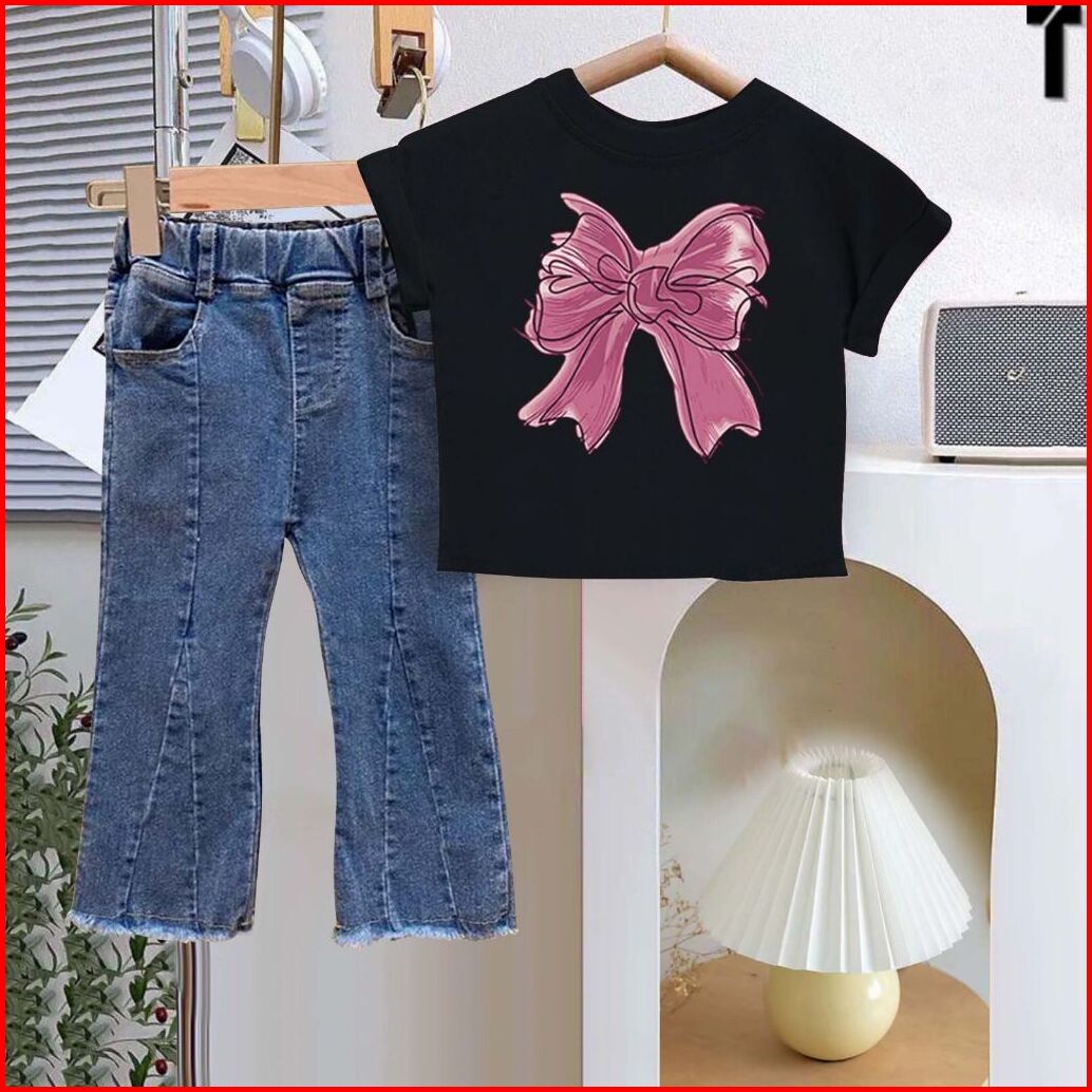 Setelan Anak Perempuan Lucu Motif Pita 1-5 Tahun Baju Kaos Dan Celana Jeans Cutbray Anak Kekinian