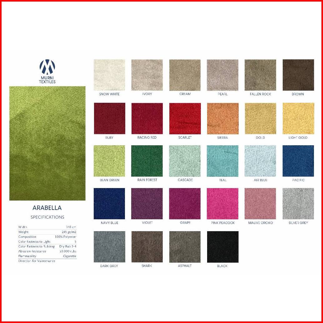 Air Blue, Brown, Cascade, Cream, Dark Grey, Fallen Rock, Gold, Ivory, Mauve Orchid, Navy Blue, Pearl, Rain Forest, Ruby, Sierra, Silver Grey, Snow White, Teal, Asphalt, Bean Green, Black, Grape, Light Gold, Pacific, Pink Peacock, Racing Red, Scarlet, Shark, Violet
