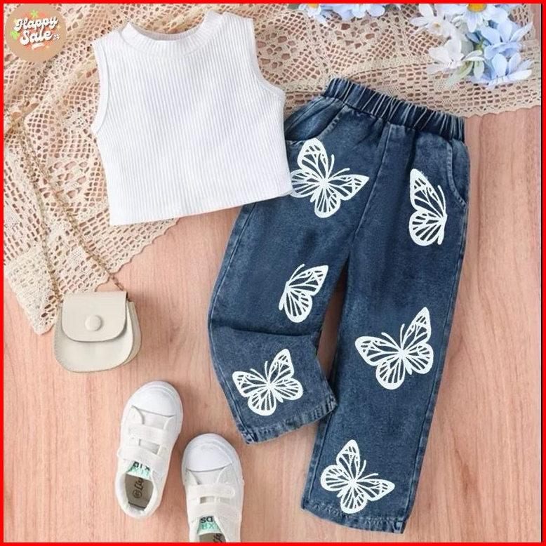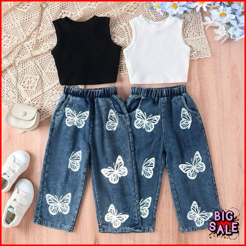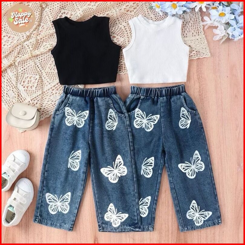 Setelan Anak Perempuan Modis Crop Top Polos Celana Jeans Kupu-kupu Lucu Usia 1-5 Tahun