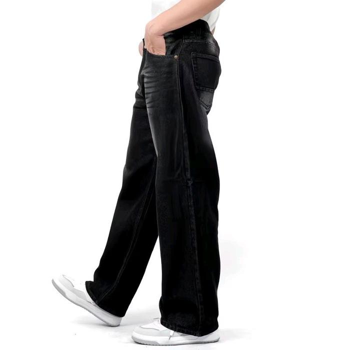 PROMISE - CELANA BAGGY JEANS WIDE LEG UNISEX WISKER LEBAR GOMBRONG SKENA BLACK WISKER PRIA WANITA JUMBO DENIM HITAM BIG SIZE PANJANG - BLACK WISKER, 34