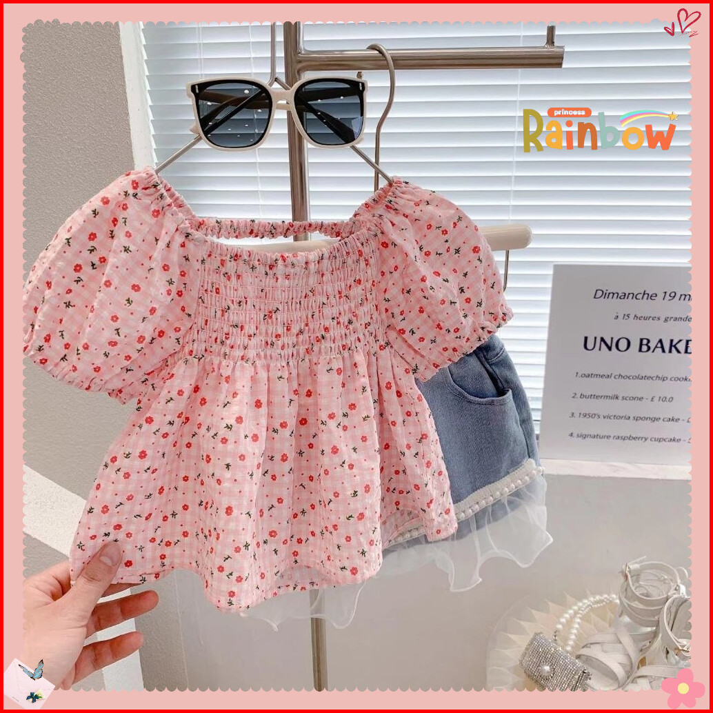 Rainbow Princess Baju Blouse Anak Perempuan Korea Lengan Pendek Bunga Santai Cute Nyaman 2-9 Tahun Bahan Katun Poliester